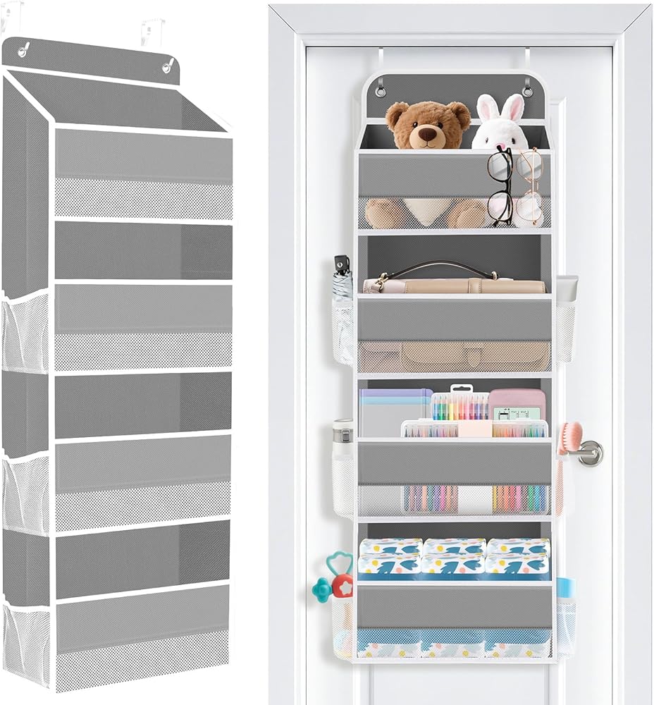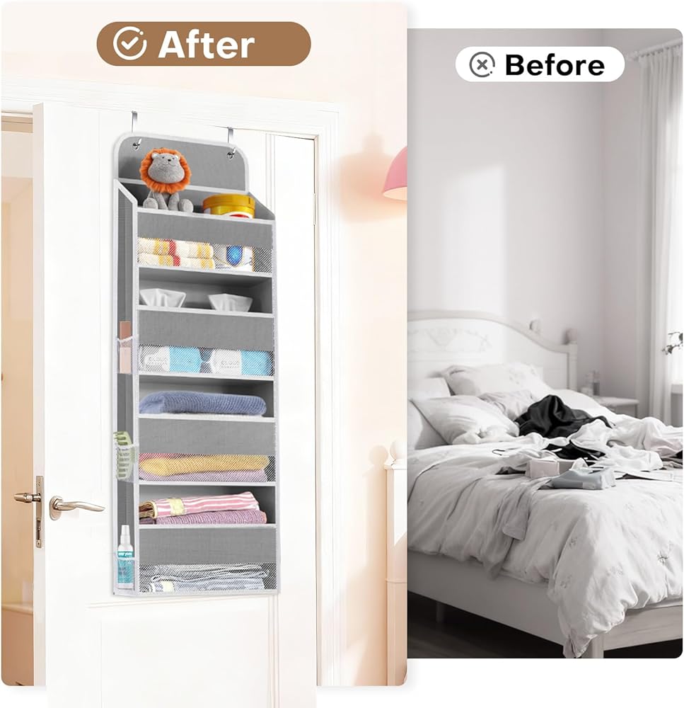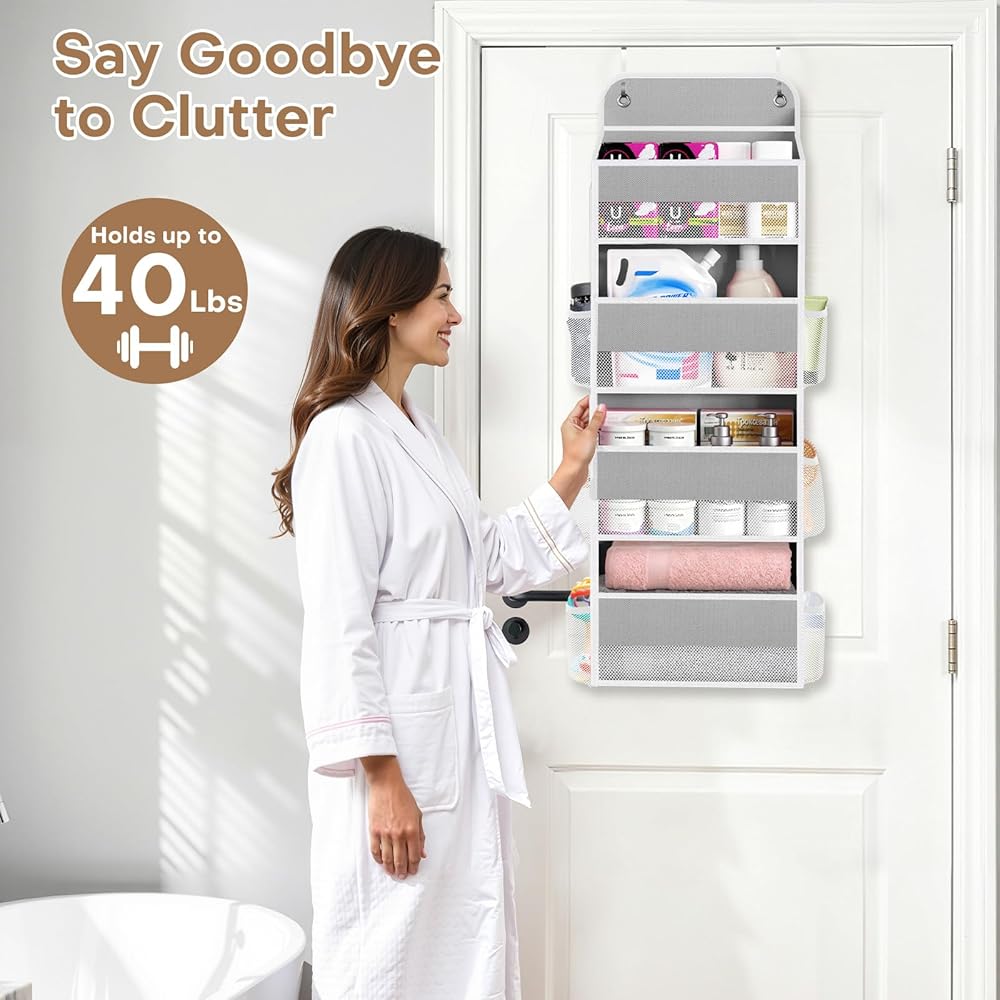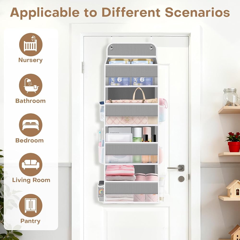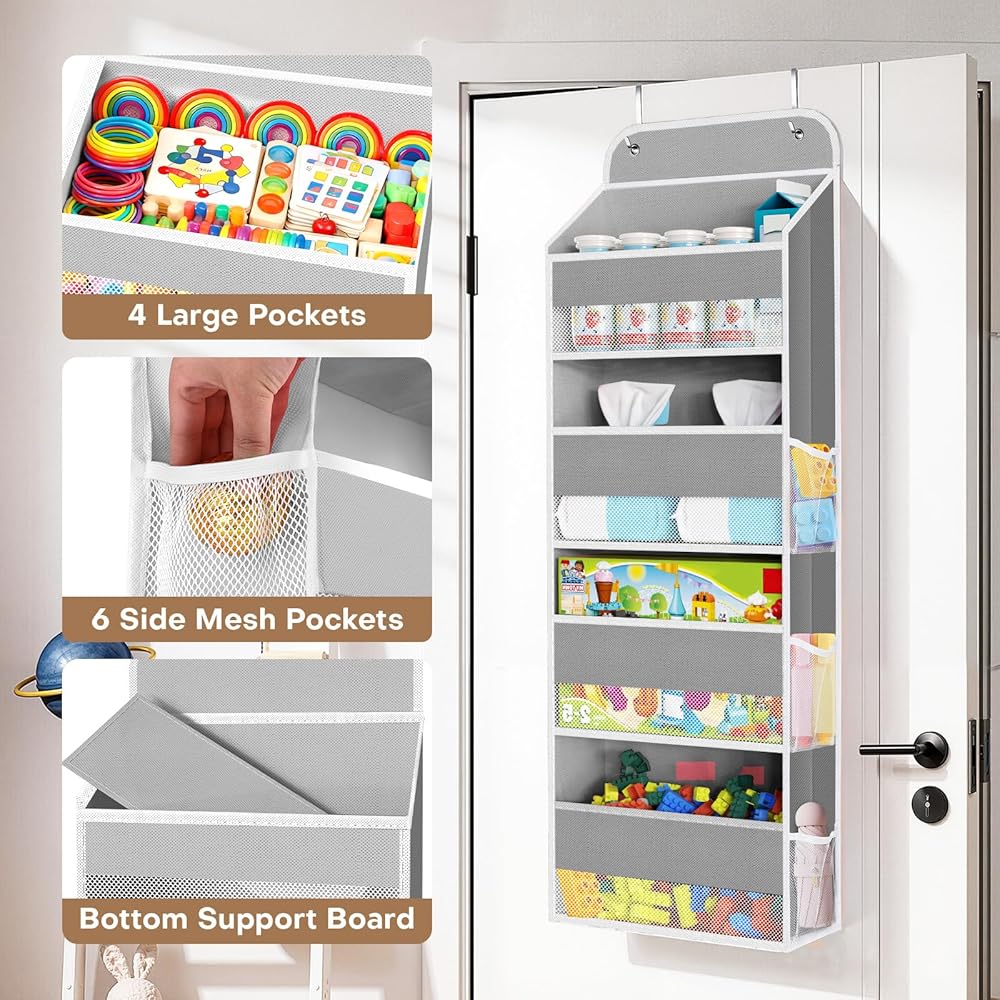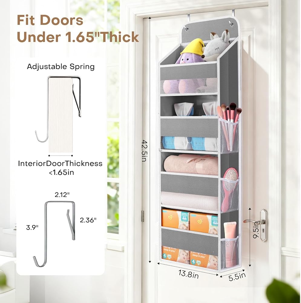 تصميم واسع: قياس 42.5 بوصة × 13.8 بوصة × 5.5 بوصة، يتميز هذا التخزين فوق الباب بـ 4 مساحات رئيسية كبيرة بالإضافة إلى 6 جيوب شبكية جانبية. يضمن البناء الشبكي المسامي أن تكون العناصر مثل الحفاضات أو أدوات النظافة أو مستلزمات الأطفال الأساسية مرئية ومتاحة بسهولة