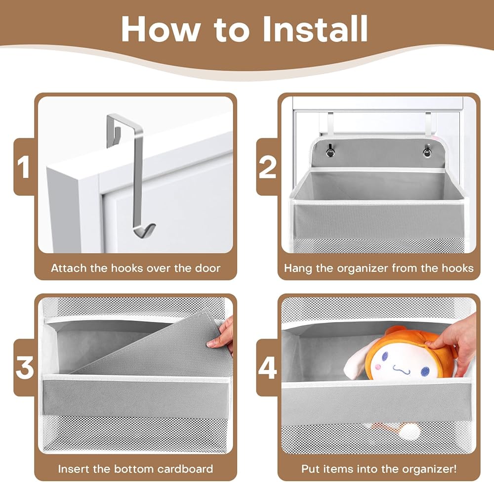 سهلة التركيب: لا حاجة لأي أدوات أو حفر! يأتي منظم أدوات الزينة مع خطافات أبواب متينة يمكن ربطها بسهولة بمعظم الأبواب القياسية (حتى سُمك 1.65 سم)، أدخل الورق المقوى السفلي، وفي ثوانٍ، ستحصل على حل تخزين أنيق جاهز للاستخدام!