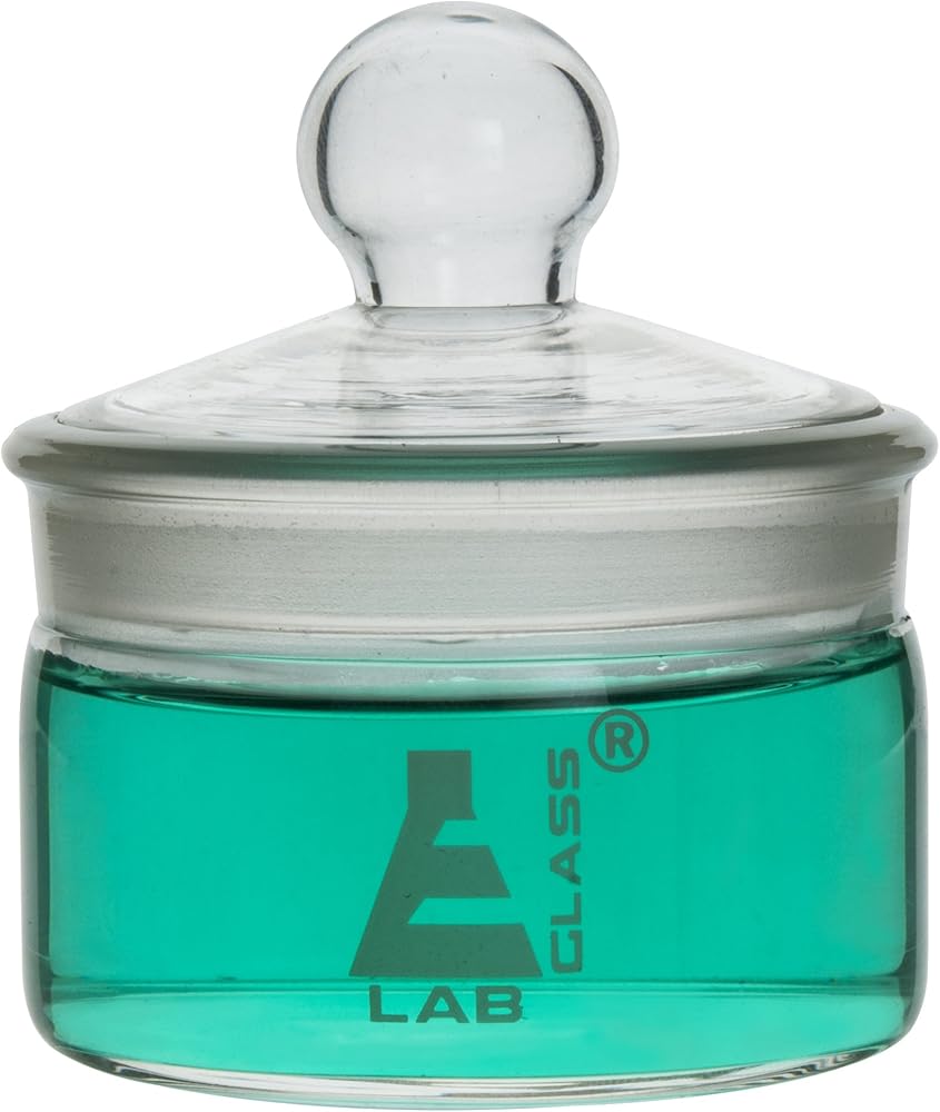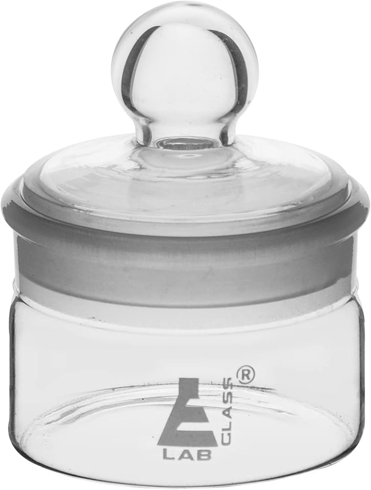 زجاجة وزن من زجاج البوروسيليكات، سعة 50 مل. القطر الخارجي 1.9 انش (50 ملم)، الطول 1.9 انش (50 ملم). قطر الفتحة 1.75 انش. تم تصميم الأواني الزجاجية من ايسكو لاستخدامها في المختبرات ولكن غالبًا ما تستخدم في المنازل أو المرآب أيضًا.
