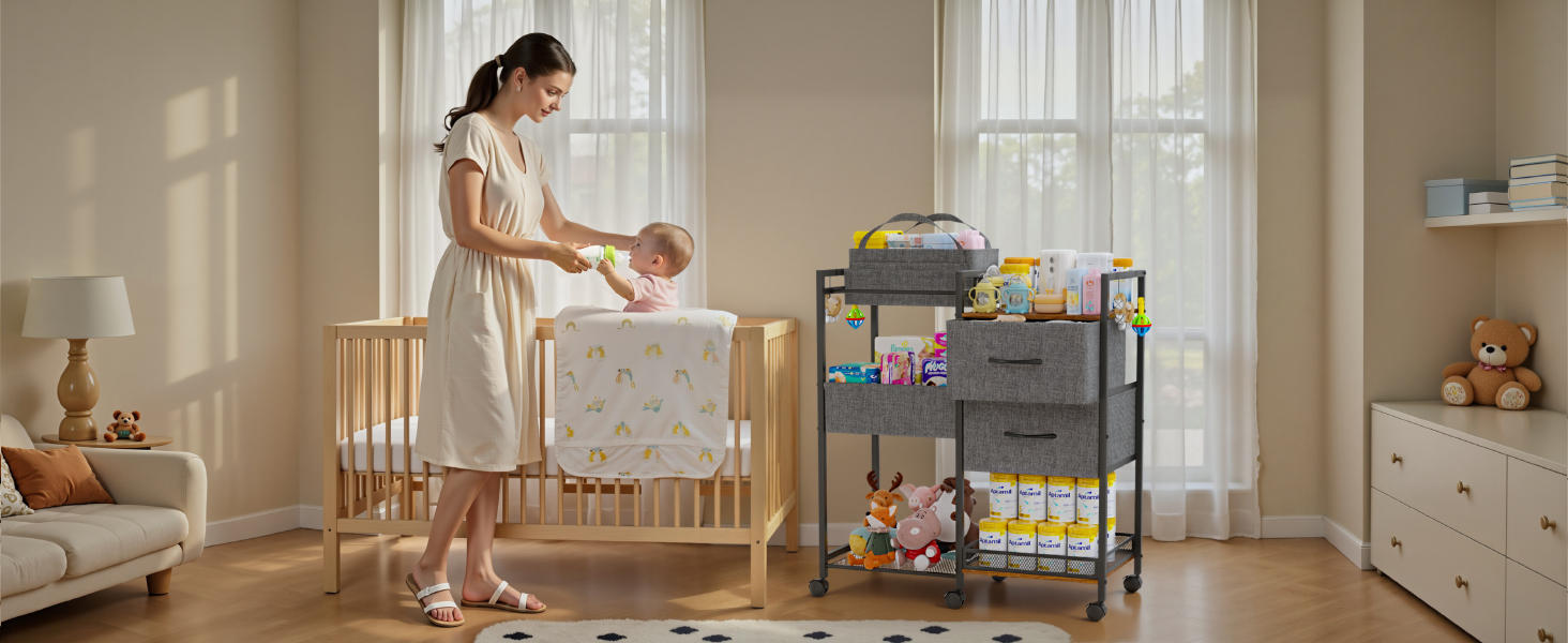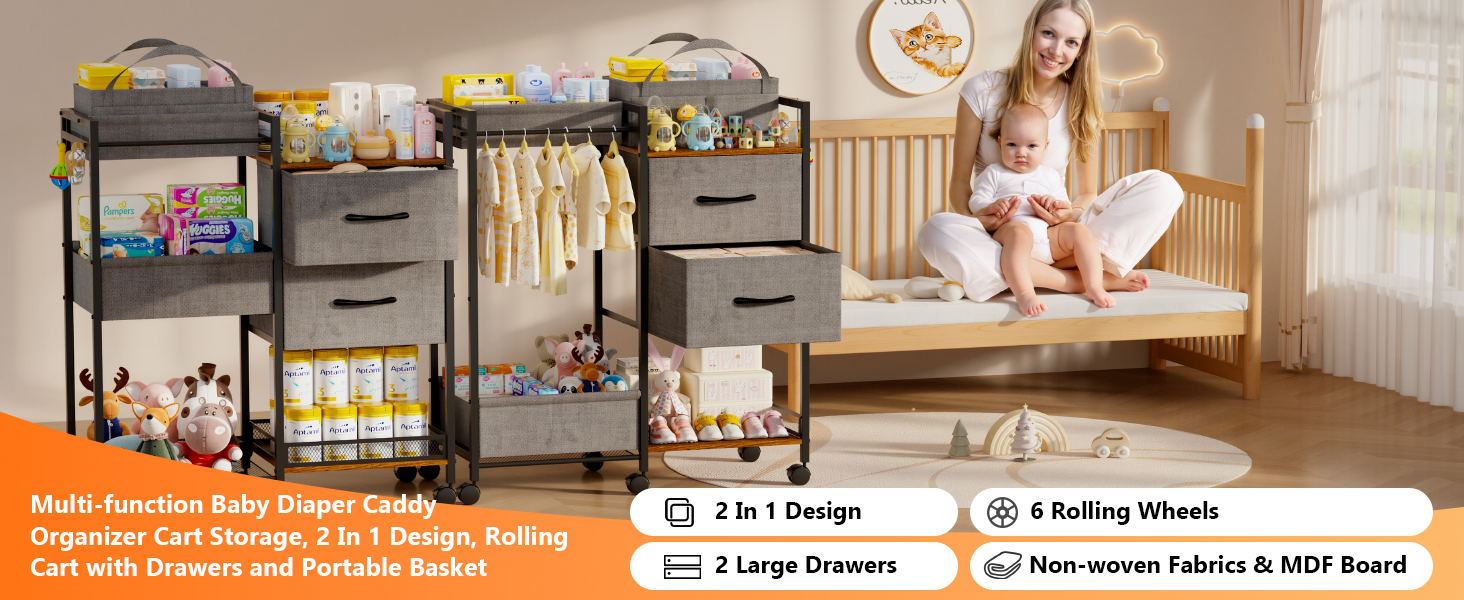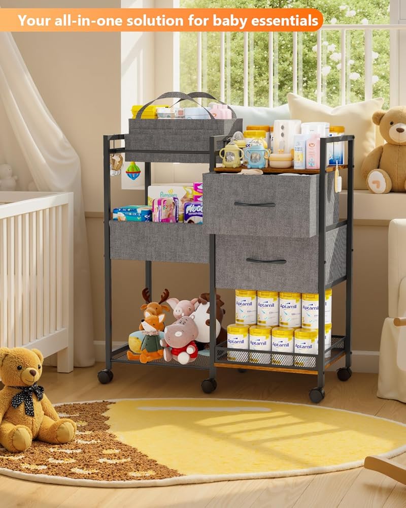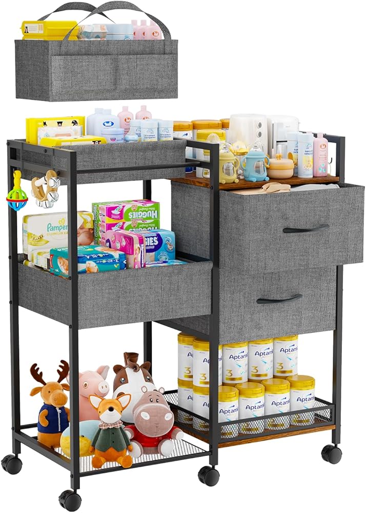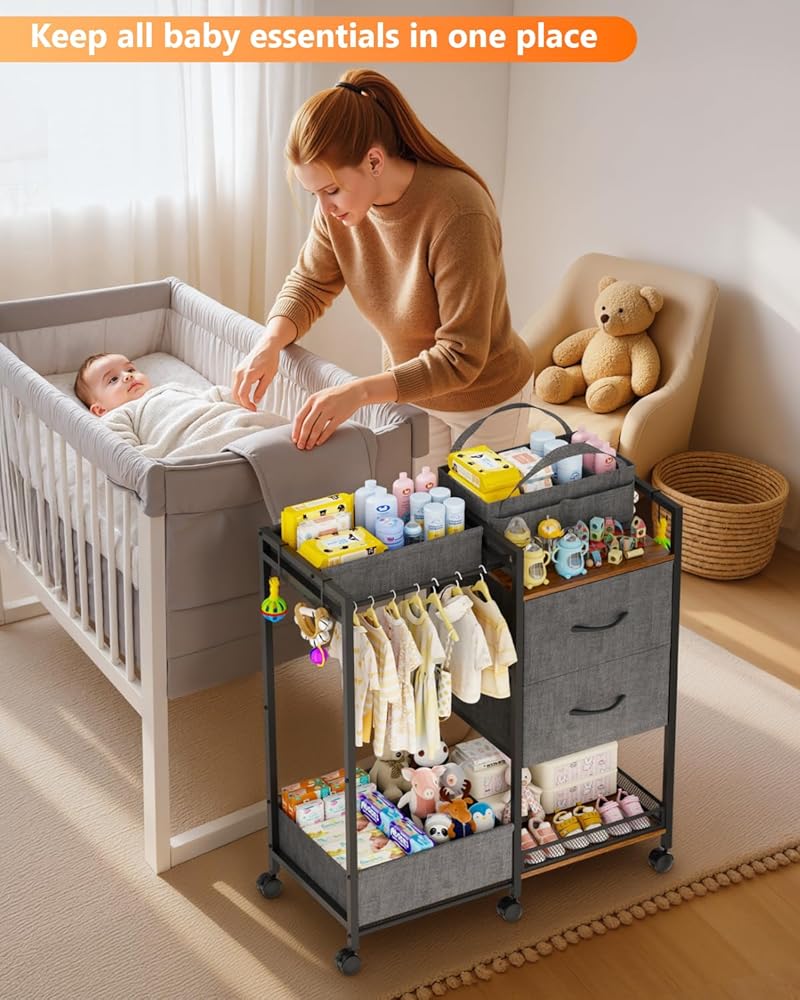 عربة تخزين الطفل مع أدراج، منظم علبة حفاضات الأطفال مع فواصل قابلة للإزالة، منظم خزانة الطفل، عربة دوارة 2 في 1 لأساسيات غرفة الأطفال ومستلزمات الأطفال