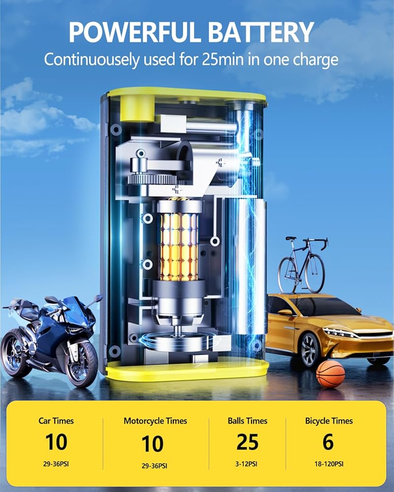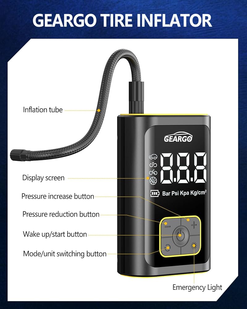 GEARGO منفاخ الإطارات المحمول ضاغط الهواء 150 رطل لكل بوصة مربعة مضخة هواء لاسلكية للسيارة والدراجات النارية وإطارات الدراجات والكرات، مضخة هواء ذكية أسرع 3 مرات مع مقياس الضغط الرقمي، ضوء LED، أسود أصفر