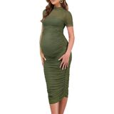 فستان طويل للحمل لحفل استقبال المولود الجديد يظهر منحنياتك الأنيقة المثيرة للإعجاب، فستان متوسط الطول شبكي أبيض مكشكش ورقبة وهمية. يتميز فستان الحمل غير الرسمي بأكمام قصيرة بكشكشة جذابة في جميع أنحاء الصورة الظلية التي تعانق الشكل حيث يصل إلى حاشية متوسطة الطول أنيقة. سحاب خلفي مخفي