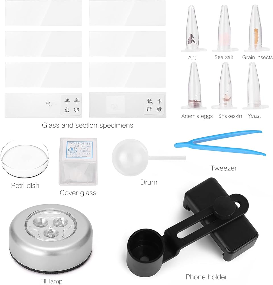 With the mating experimental equipment, which includes: fill lamp, phone holder, tweezer, trumpets, biological specimens, cover glass and so on, so you can use them directly, you do not need to buy them one by one, save your time and money.