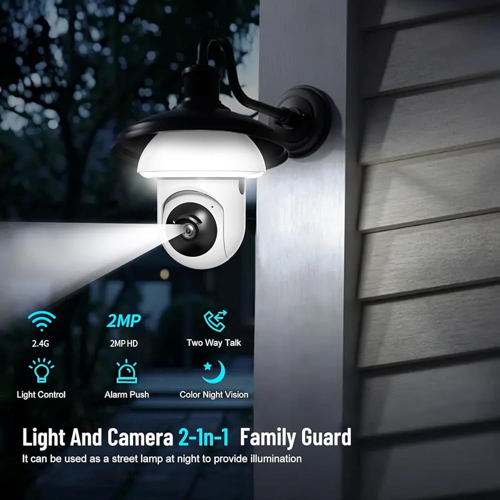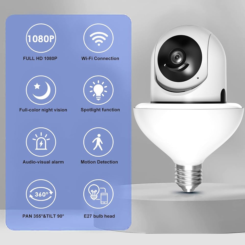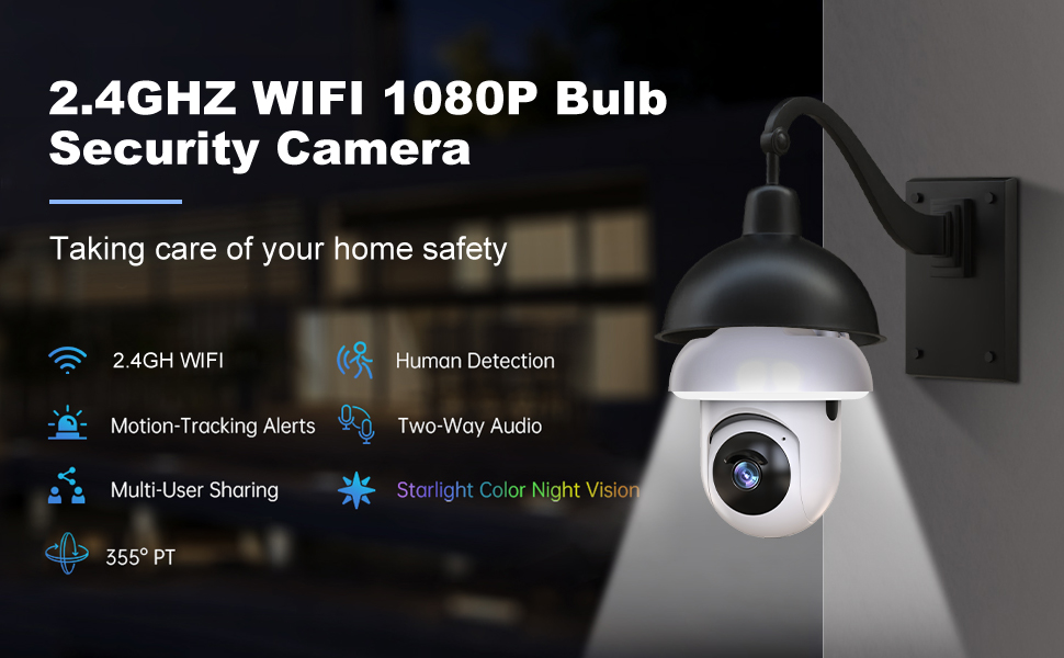واي فاي 2.4 جيجا هرتز: تتميز كاميرا الأمان بمصابيح الإضاءة 2.4 جيجا بقدرة أقوى على استقبال الإشارة، واستقرار أعلى، ومسافة استخدام أطول، وبدون تأخير، وفيديو أكثر سلاسة في الوقت الفعلي. ما عليك سوى ربط لمبة إضاءة الكاميرا الخارجية بقاعدة لمبة الإضاءة E26 المجهزة (AC110/240V) وتوصيله بمنفذ طاقة لتوصيل كاميرا لمبة الإضاءة الخارجية 360 درجة واي فاي بشبكة wifi المنزلية والهاتف.