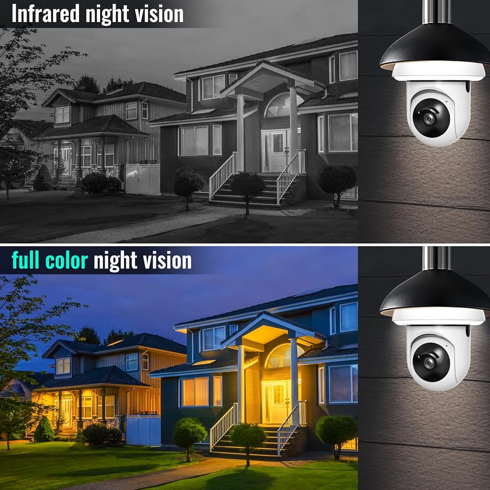 وظيفة الرؤية الليلية بالفيديو والألوان بدقة 1080 بكسل: تدعم الكاميرات الخارجية لأمن المنزل صورة 1080 بكسل، الصورة واضحة جدًا في النهار والليل. تدعم كاميرا Lightbulb الرؤية الليلية الملونة/الأشعة تحت الحمراء، ويمكن لكاميرات الأمان اللاسلكية في الهواء الطلق مراقبة الأشياء بوضوح في نطاق 33 قدمًا في بيئة الإضاءة المنخفضة، وتجربة رؤية ليلية ممتازة تضمن سلامة منزلك