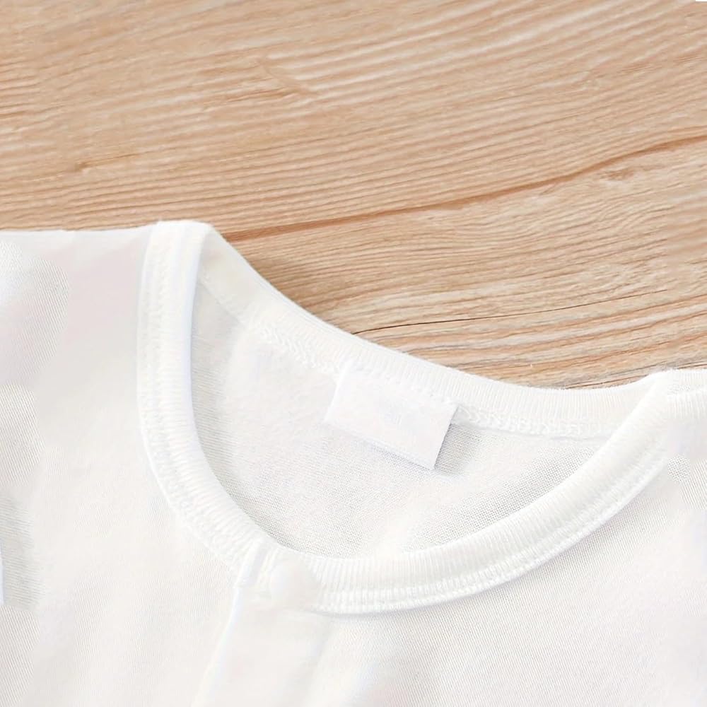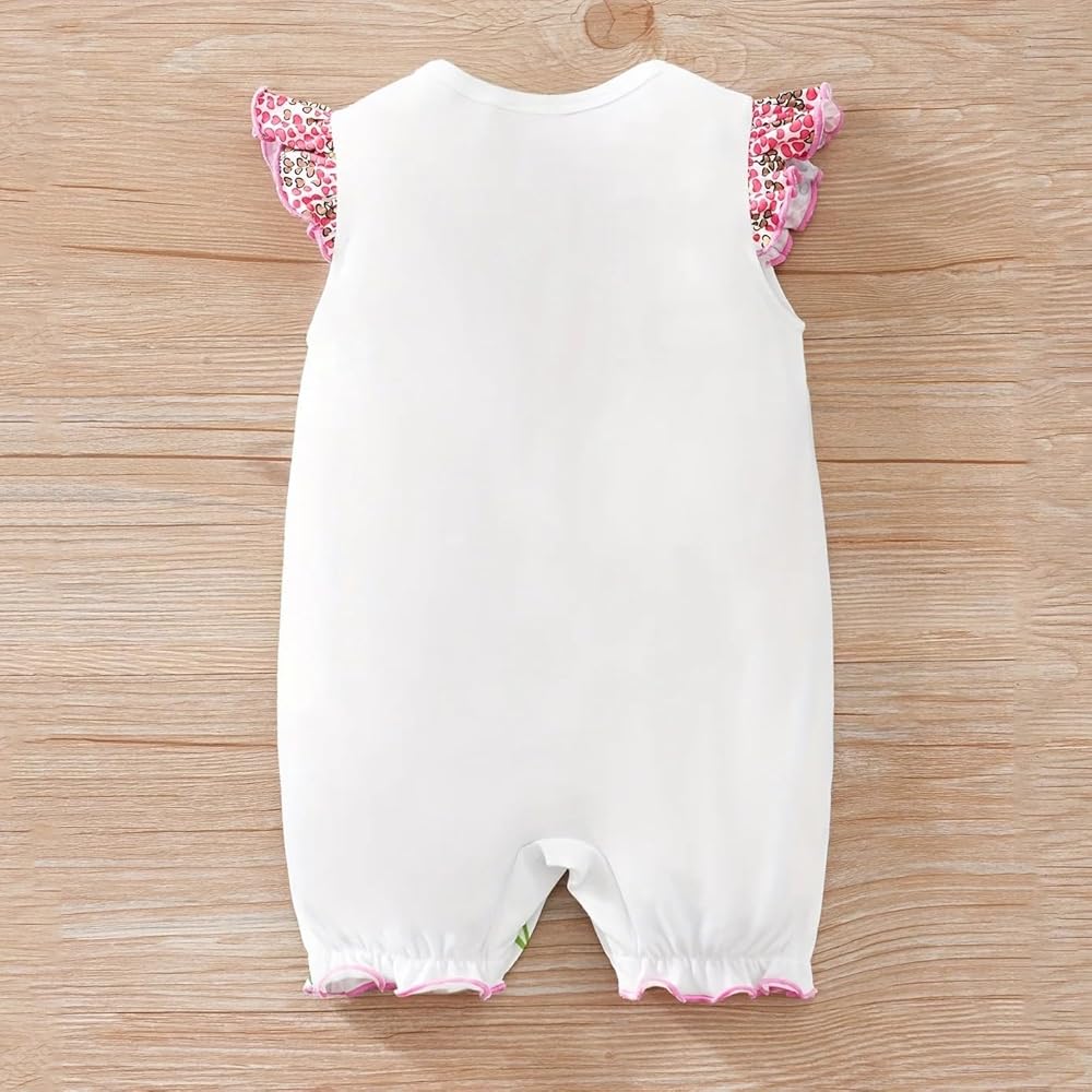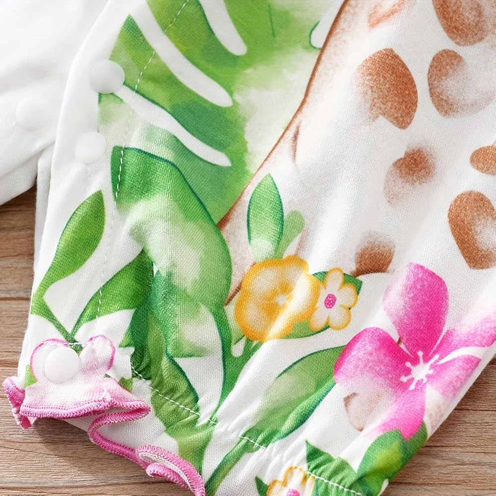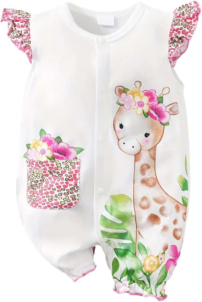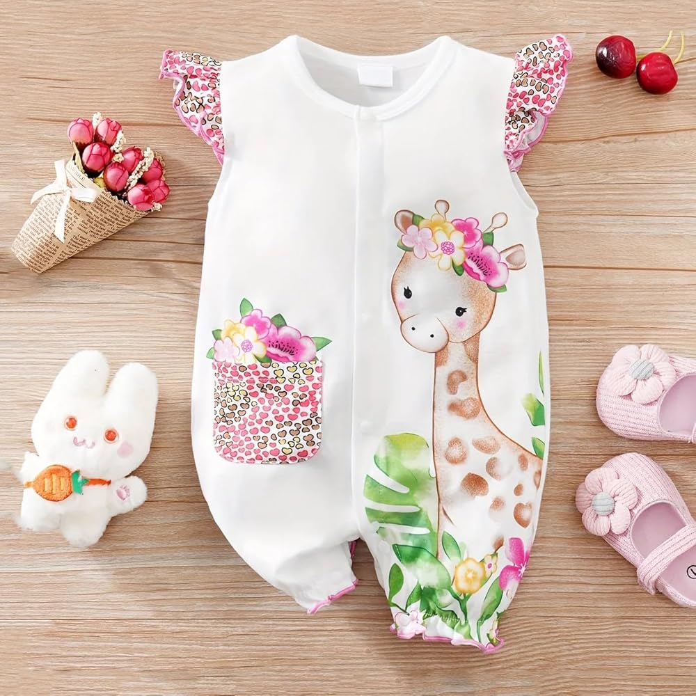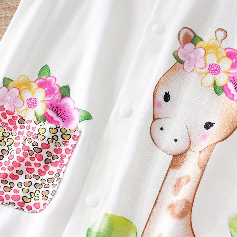 Dress your little one in adorable style with this charming baby romper featuring a whimsical giraffe design. The white one-piece outfit is adorned with a sweet giraffe illustration wearing a crown of orange and pink daisies, creating an enchanting safari-inspired look. The romper includes flutter sleeves with giraffe-print ruffles, matching ruffled leg openings, and a convenient front pocket with coordinating print. Perfect for summer wear, this sleeveless design keeps baby cool while looking cute. The bodysuit is crafted with attention to detail, from the delicate floral accents to the playful giraffe spots in warm peachy tones. Ideal for everyday wear, special occasions, or memorable photo opportunities, this romper combines comfort with irresistible charm. The easy-wear design makes dressing and diaper changes simple, while the soft fabric ensures your baby stays comfortable throughout their adventures.