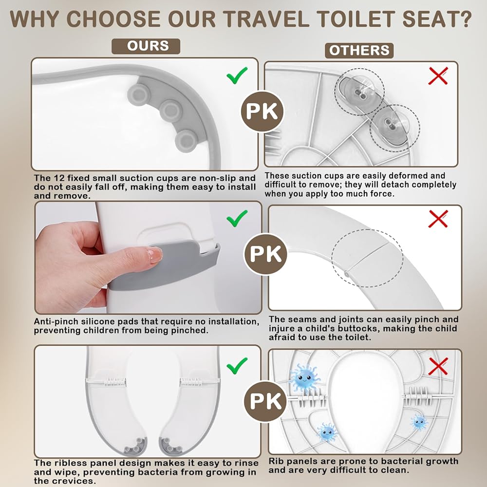 ✨ صحي وسهل التنظيف: يخلق مقعد المرحاض المحمول هذا حاجزًا وقائيًا بين طفلك والحمامات العامة. مصنوعة من مادة ABS متينة ومقاومة للماء وعديمة الرائحة، ويمكن تنظيفها بالمسح في ثوانٍ. التصميم المدمج يعني أنه لا يلمس الجزء الداخلي من حقيبتك أبدًا، مما يحافظ على نظافة كل شيء آخر.