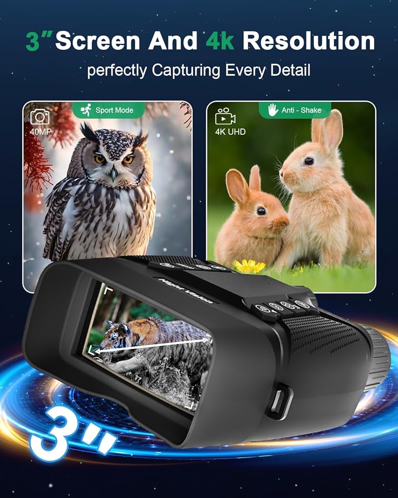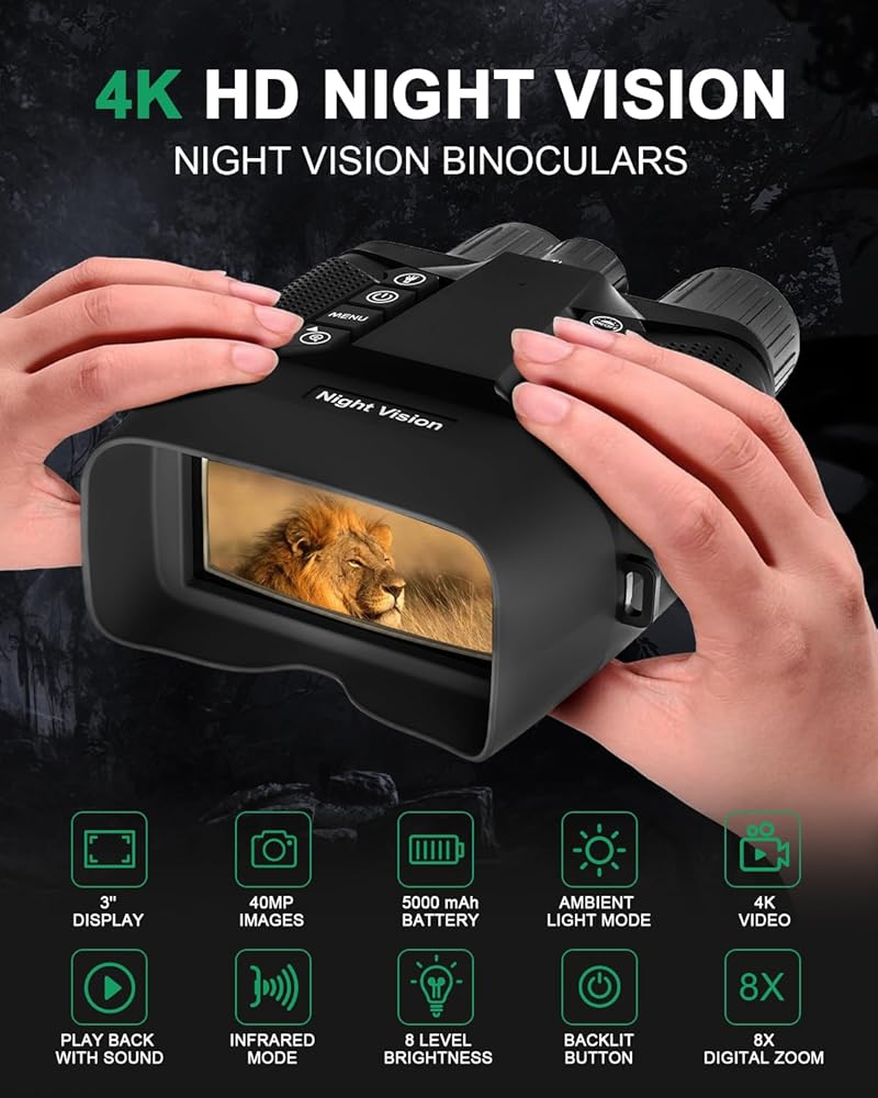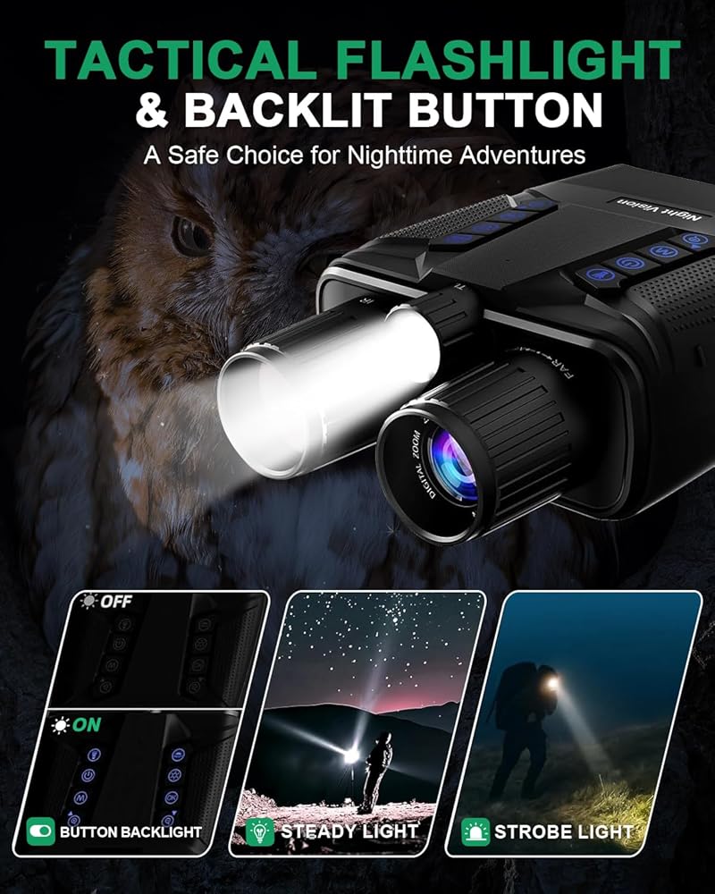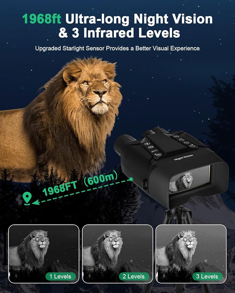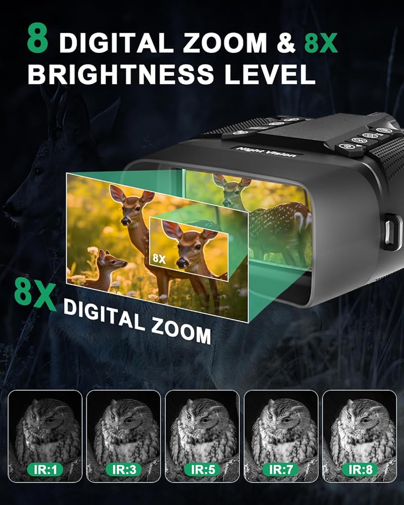 شاشة كبيرة غامرة: توفر شاشة TFT عالية الدقة مقاس 3 بوصات لنظارات الرؤية الليلية صورًا مشرقة وواضحة، مع تكبير رقمي 8x ومسافة رؤية ليلية تصل إلى 1968 قدمًا. يحتوي مناظير الرؤية الليلية للبالغين على ضوء الأشعة تحت الحمراء القوي 3 وات 850 نانومتر و8 مستويات لتعديل السطوع، مما يسمح لك بالتعديل بحرية في ظروف الإضاءة المختلفة، ويمكن تشغيل تصميم زر الإضاءة الخلفية بسهولة حتى في أحلك البيئات، مما يوفر ضمان أفضل تأثير للمراقبة.