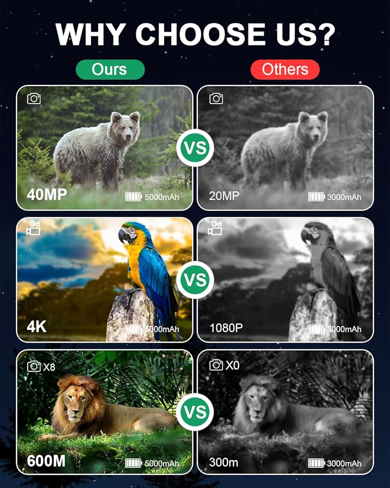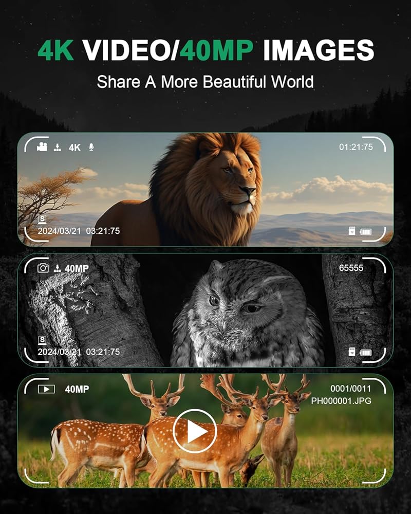 رؤية ليلية بدقة 4K HD: تستخدم نظارات الرؤية الليلية أجهزة استشعار على مستوى ضوء النجوم وأوضاع الرؤية الليلية المزدوجة، جنبًا إلى جنب مع كاميرا فائقة الوضوح بدقة 40 ميجابكسل وتسجيل فيديو بدقة 4K، مما يضمن أنه يمكنك التقاط كل التفاصيل بوضوح حتى في الظلام الدامس أو البيئات منخفضة الإضاءة. سواء كانت مراقبة الحياة البرية أو الصيد أو القيام بدوريات في المزرعة، فإن مناظير الرؤية الليلية يمكن أن توفر تجربة بصرية ممتازة، مما يسمح لك بالاستمتاع بكل لحظة في الظلام.
