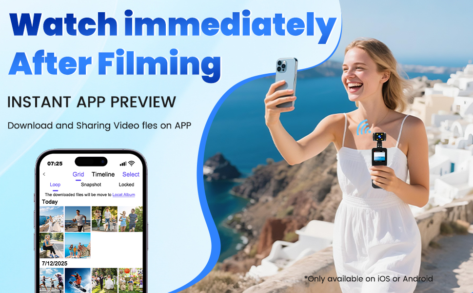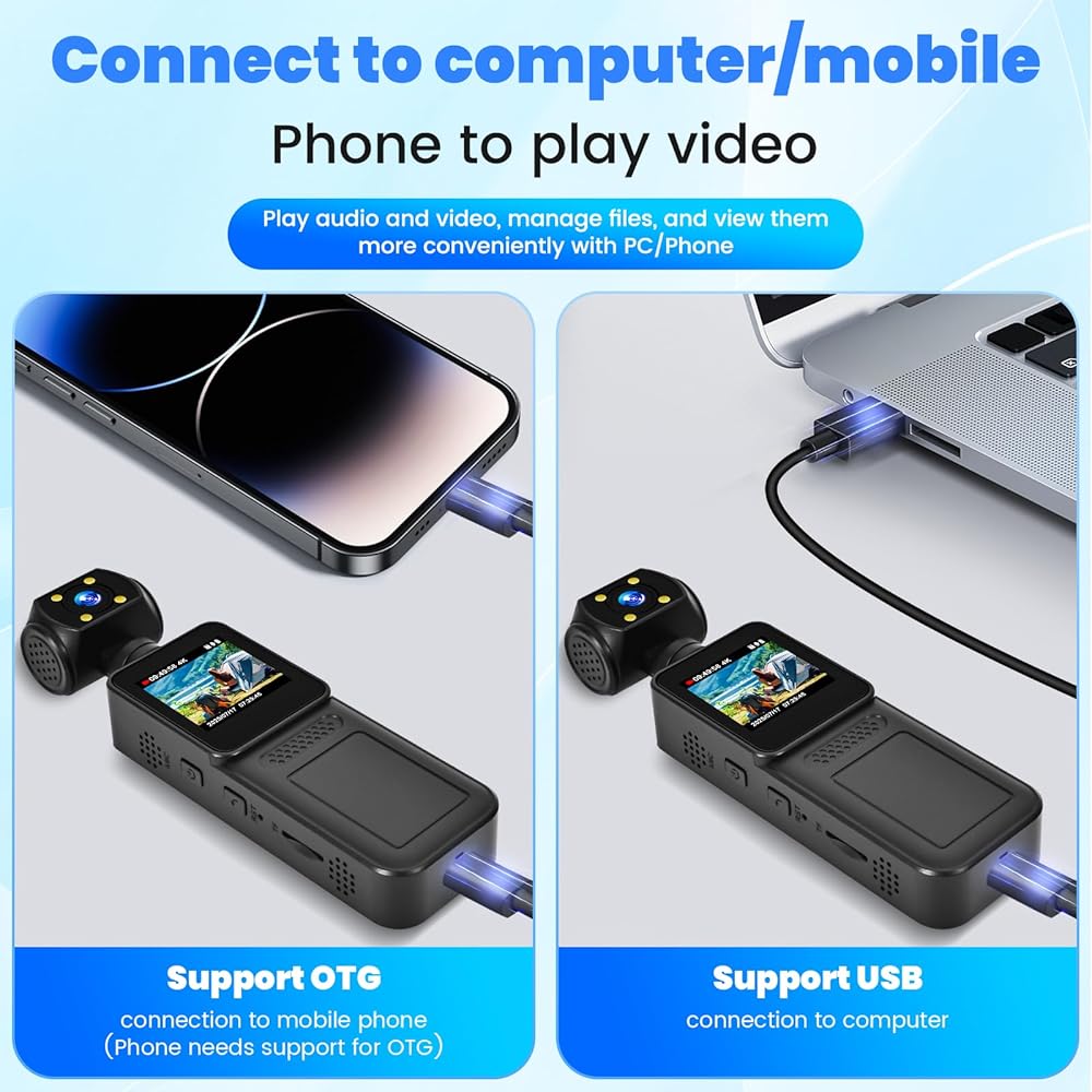 【دعم WiFi ومراقبة في الوقت الحقيقي】تتصل كاميرا Pocket Body بهاتفك الذكي عبر WiFi للبث المباشر والتحكم عن بعد وتشغيل الفيديو الفوري. يمكنك نقل الملفات أو مشاركة اللقطات بسهولة بدون كابلات (متوافق مع iOS/Android).