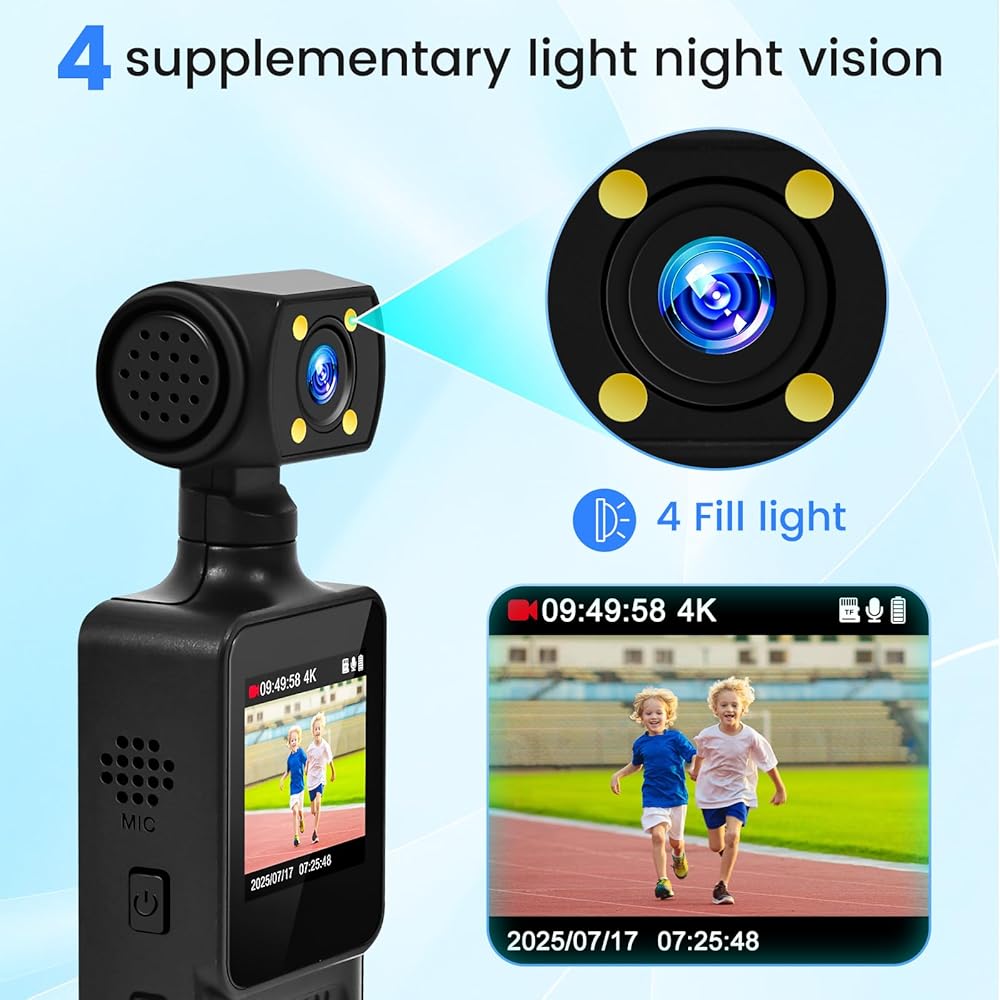 【رؤية ليلية و4K】تلتقط كاميرا الجيب القابلة للارتداء فيديو بدقة 4K نهارًا أو ليلاً باستخدام تقنية الإضاءة المنخفضة المتقدمة. مع 4 مصابيح إضاءة إضافية، مثالية للأمان أو المغامرات الخارجية أو جمع الأدلة.