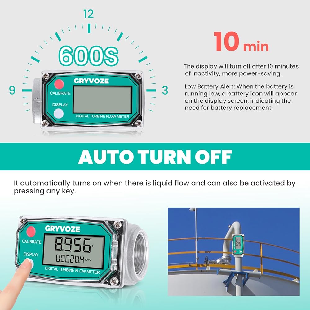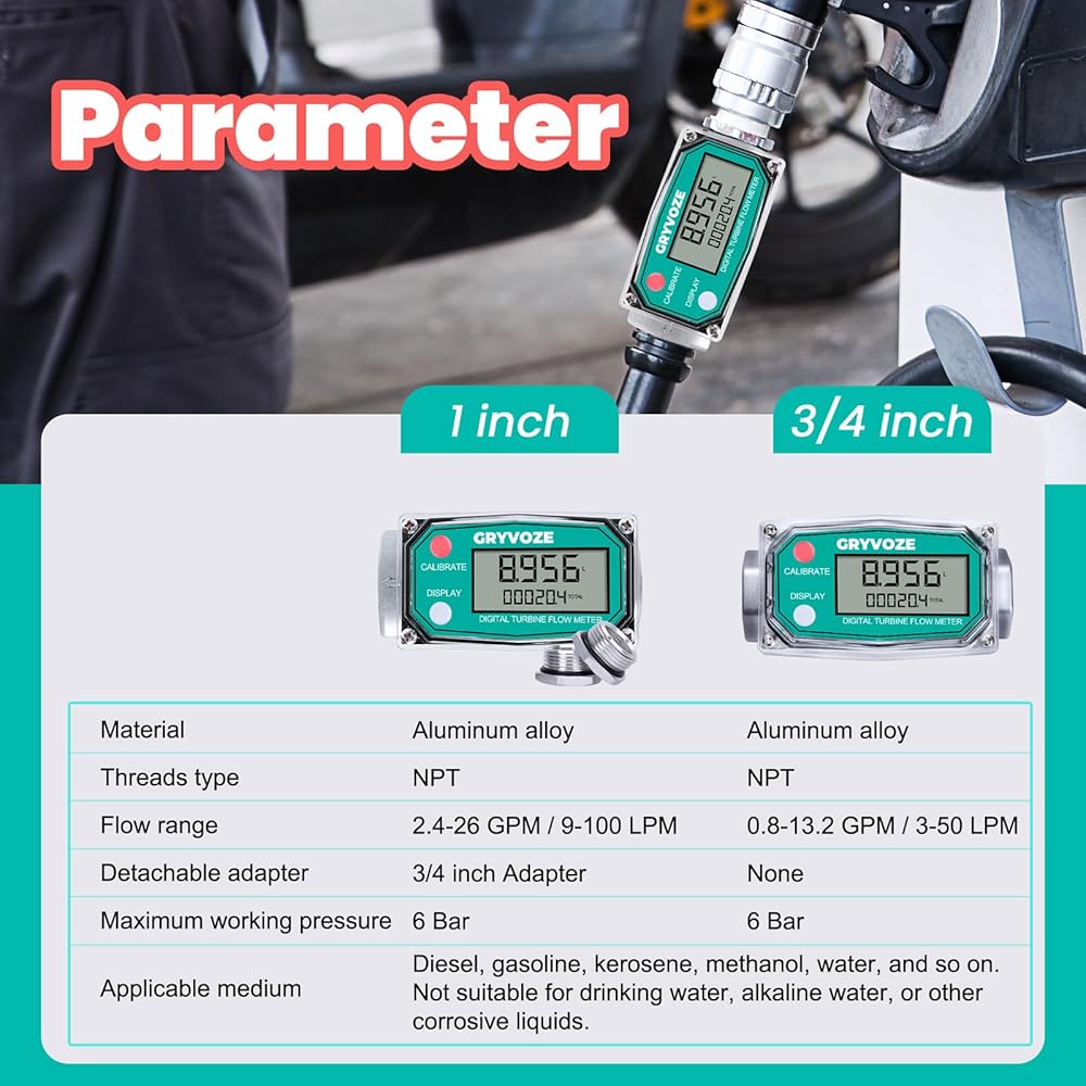 مقياس تدفق الوقود التوربيني الرقمي مقاس 1 بوصة من GRYVOZE، مقياس تدفق خيط NPT مضمن 2.6-26 GPM مع محولات 3/4 بوصة للمياه والديزل وزيت الغاز والبنزين والسوائل الأخرى - يدعم جالون، QTS، PTS، L، m³