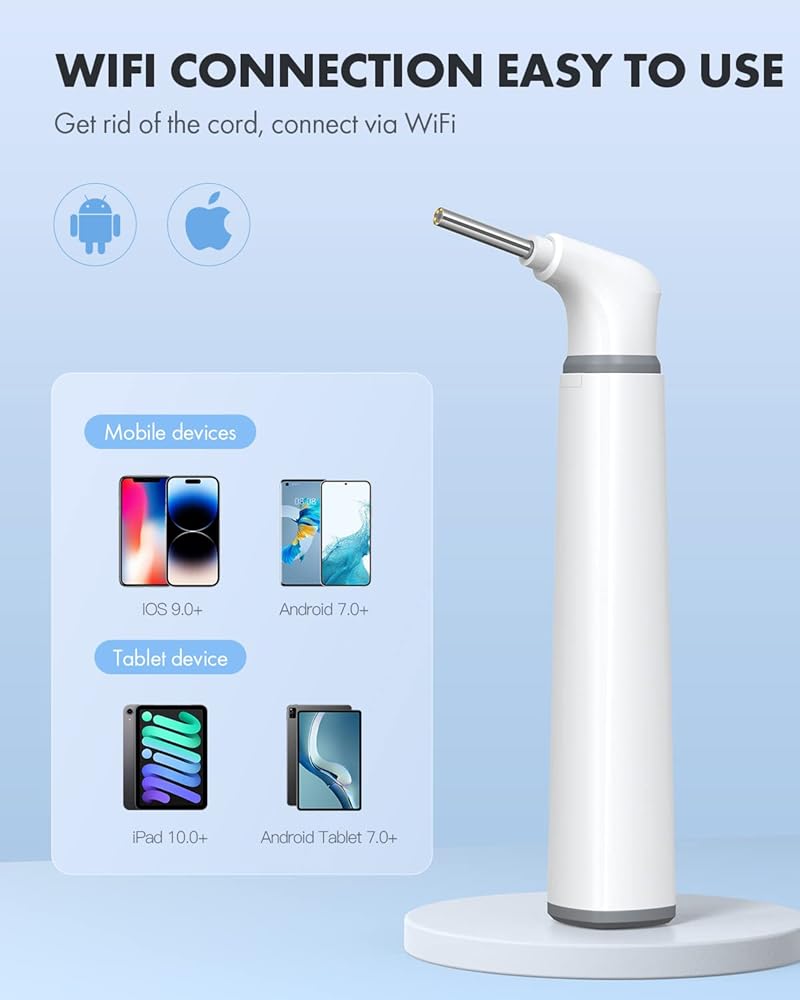 متوافق مع Apple iOS وAndroid - يعمل منظار الأذن WiFi الخاص بنا بشكل جيد على أجهزة iPhone وiPad وAndroid والكمبيوتر اللوحي. قم بتنزيل التطبيق المجاني "Smart Endscope" من متجر تطبيقات ios أو متجر Google Play.