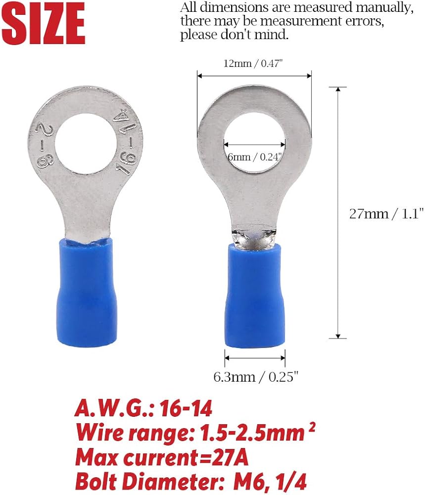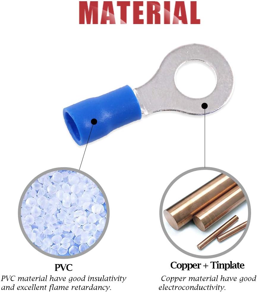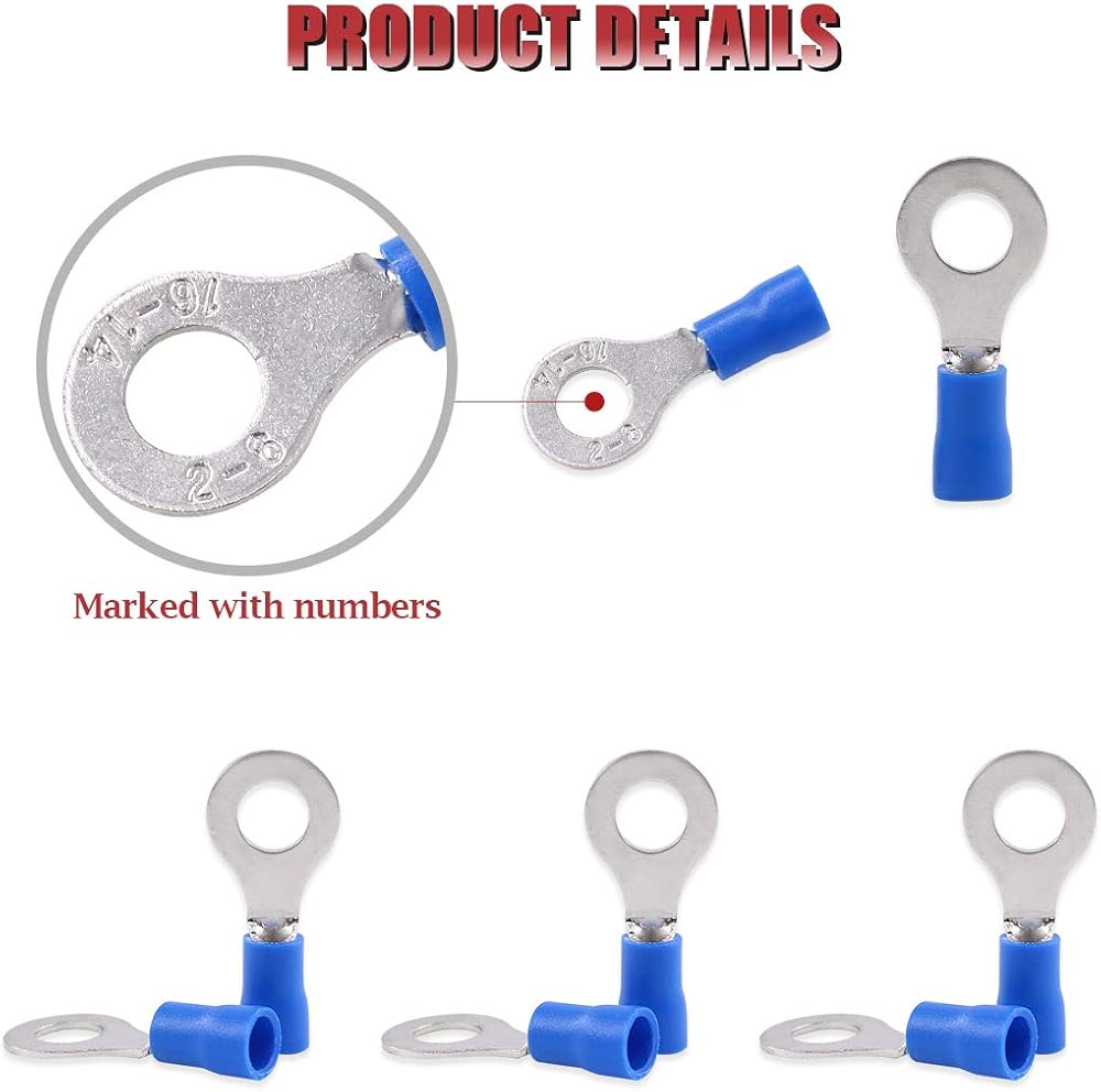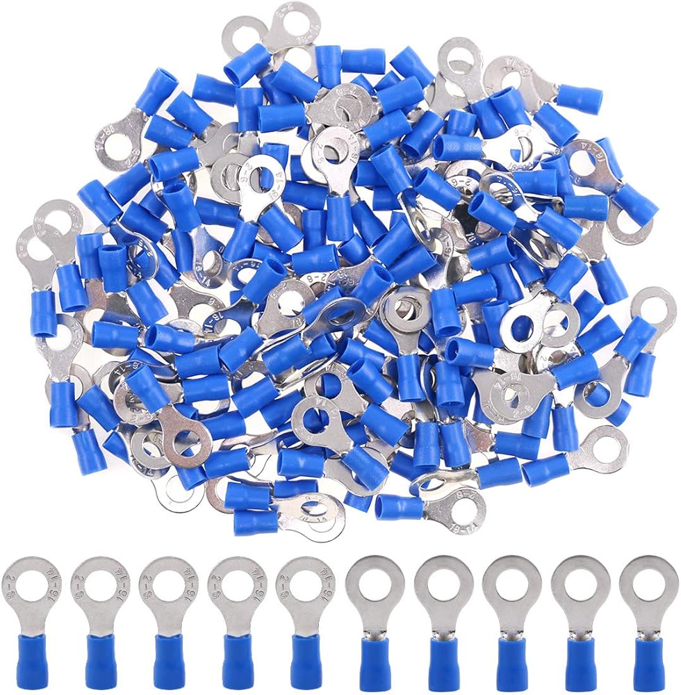 موصلات تجعيد الأسلاك الكهربائية بحلقة محطات معزولة 100 قطعة 16-14AWG من هيليتشي (أزرق، M6)