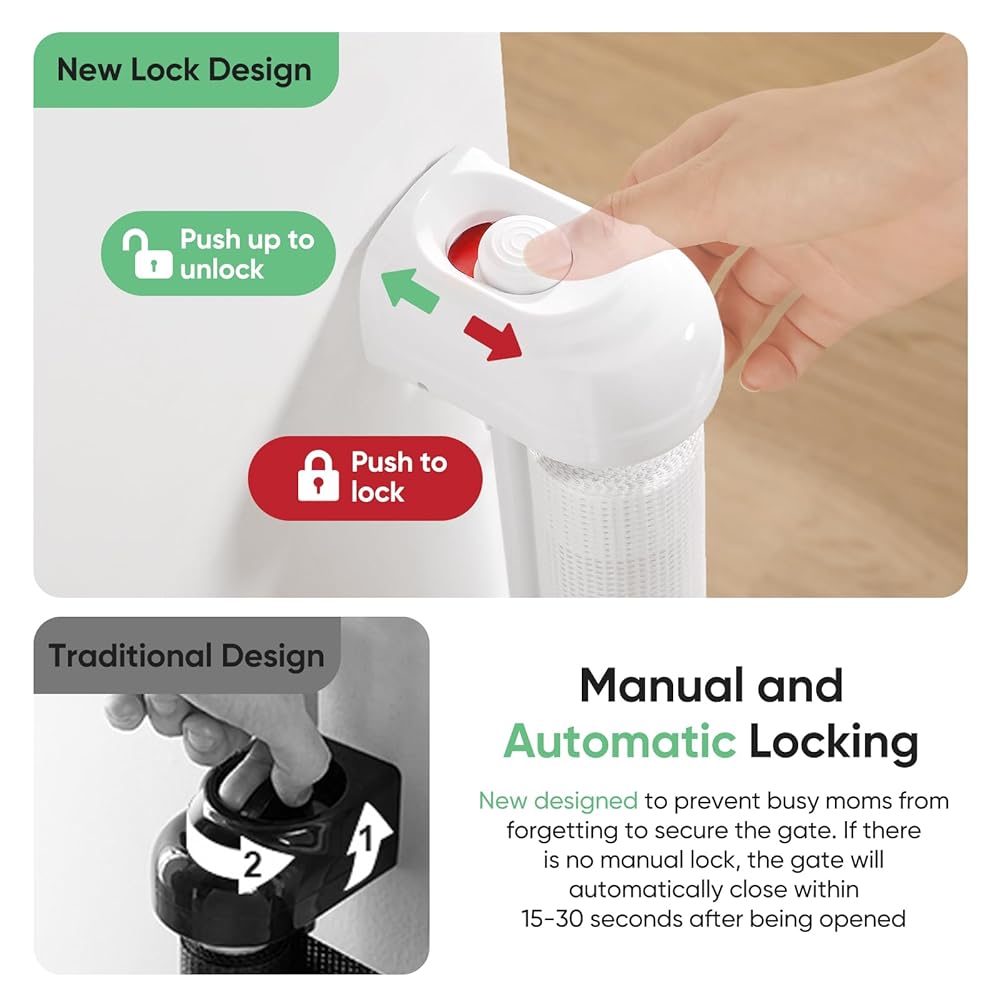 【تصميم قفل أمان جديد】يعمل تصميم القفل المبتكر الخاص بنا على دفع غطاء الكرة لقفل البوابة وفتحها بسهولة بيد واحدة. والأهم من ذلك، إذا نسيت قفل البوابة، فسيتم قفل البوابة تلقائيًا خلال 15 إلى 30 ثانية لتعزيز الأمان. توفر بواباتنا السهلة القابلة للسحب عملية سهلة، مما يسمح لك بفتحها وإغلاقها بيد واحدة أثناء حمل طفلك أو حمل أشياء مثل الألعاب والحفاضات.