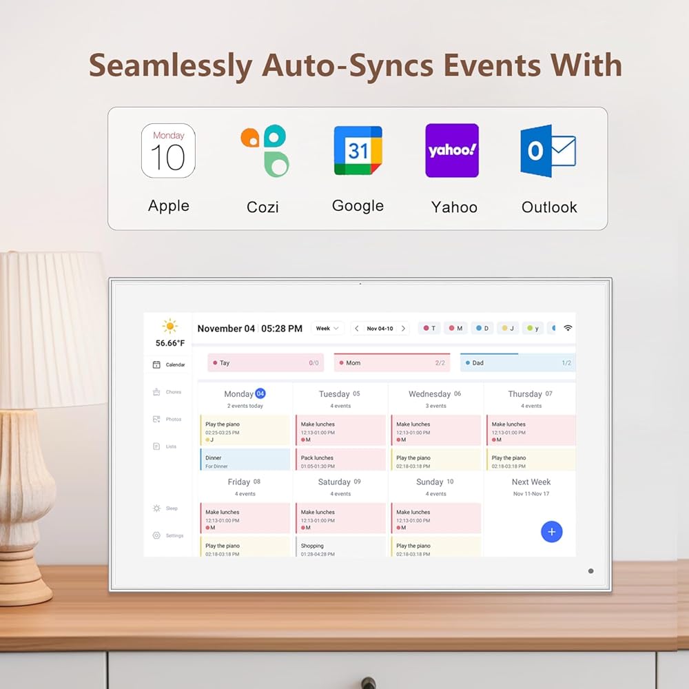✍الإعداد في ثوانٍ: قم بتوصيله، والاتصال بشبكة Wi-Fi، وستكون جاهزًا للانطلاق! مزامنة الأحداث والمهام على الفور مع تقويم Google، وOutlook، وCozi، وYahoo Calendar، والمزيد - محدثة دائمًا. أضف أحداثًا أو مهام مباشرة على الجهاز أو عبر تطبيقنا المجاني للهاتف المحمول.