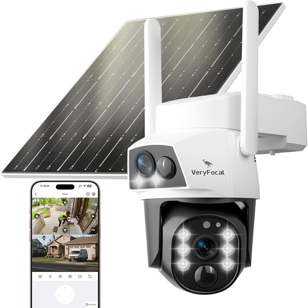 كاميرا أمان مزدوجة العدسات تعمل بالطاقة الشمسية، 4 ميجابكسل 360 درجة PTZ لاسلكية في الهواء الطلق و2.4 جيجا هرتز/5 جيجا هرتز واي فاي، مع رؤية ليلية كاملة الألوان، صوت ثنائي الاتجاه وIP66 مقاوم للماء للمراقبة المنزلية
