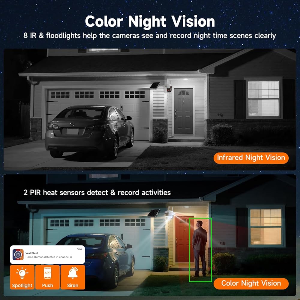 رؤية ليلية ملونة للكشف عن الأشعة تحت الحمراء: عندما يكتشف مستشعر الحرارة PIR شخصًا، تتحول الكاميرا من وضع الرؤية الليلية بالأشعة تحت الحمراء إلى وضع الألوان الكاملة، ويتم إرسال إشعارات الدفع إلى الهواتف المحمولة، مما يقلل من النتائج الإيجابية الزائفة.