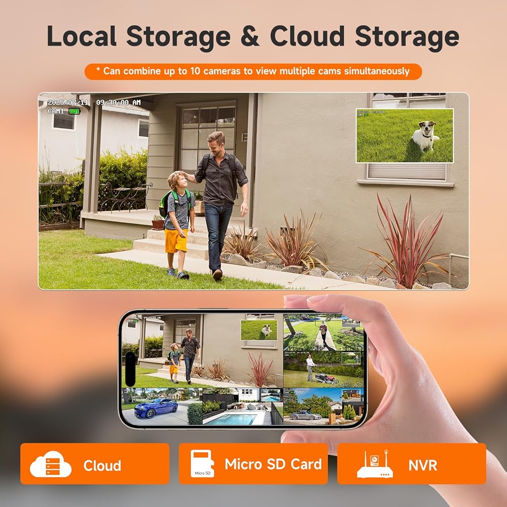 تخزين SD/NVR/Cloud: يمكن حفظ مقاطع الفيديو المسجلة على بطاقة الذاكرة (حتى 256 جيجا، بطاقة الذاكرة غير متضمنة)، أو توصيلها بـ NVR أو التخزين السحابي. لا توجد رسوم شهرية، تجربة مجانية إلى الأبد، تعمل مع Alexa.