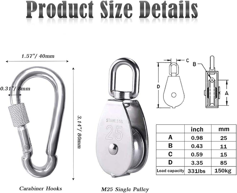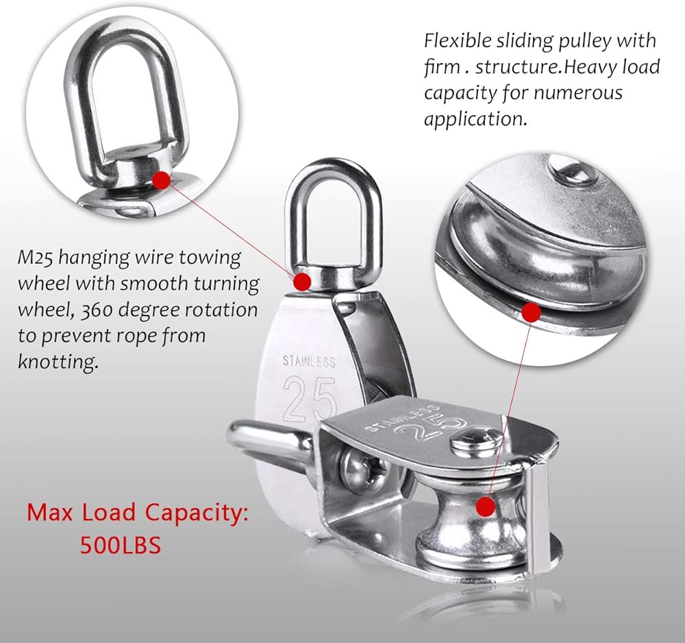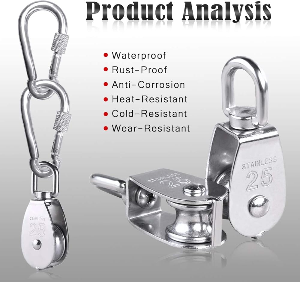 【جودة ممتازة】- مصنوعة من الفولاذ المقاوم للصدأ 304 مما يجعلها متينة، كل من البكرة المنزلقة والحلقات المعدنية مقاومة للصدأ ويمكنها حمل حوالي 331 رطلاً من القوة، وهيكل قوي عالي التحمل. مصممة لتعليق الأشياء ذات الوزن لتخفيف الحمل
