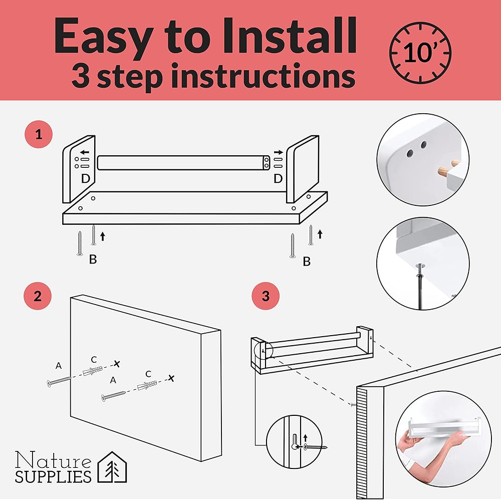 تركيب سهل - لا يحتاج إلى نجار! قم بتركيب أرفف الأكريليك العائمة الجديدة في 4 خطوات بسيطة فقط. نقوم بتضمين تعليمات واضحة وسهلة الاتباع وجميع التركيبات الضرورية وحتى مفك براغي مجاني. أرفف كتب حضانة بسيطة وخالية من التوتر.