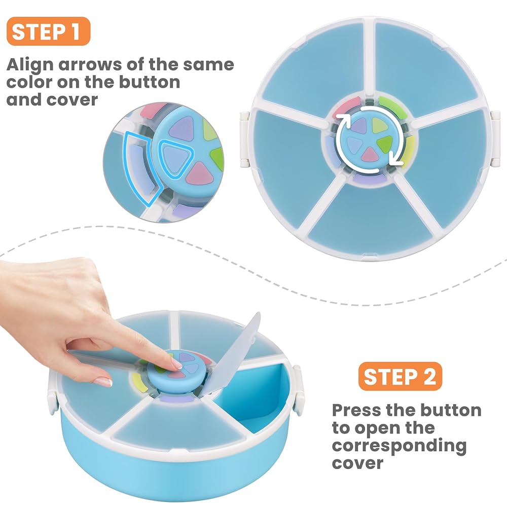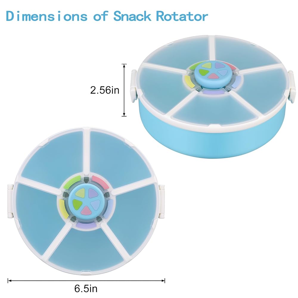 جهاز دوار للوجبات الخفيفة مع زر: تأتي حاويات الوجبات الخفيفة الخاصة بنا مع أزرار تفاعلية، قم بتدوير اللون على الزر بحيث يتطابق اللون الموجود على الغطاء مع اللون الموجود على الزر، ثم اضغط على الزر لفتح الحجرة المقابلة. دع طفلك يستمتع بالوجبة الخفيفة بينما يستمتع بالمرح في نفس الوقت.