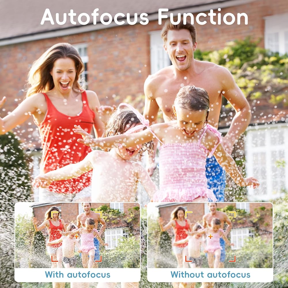 【تركيز تلقائي، كاميرا عالية الدقة】 تتميز هذه الكاميرا المدمجة بدقة صورة عالية الدقة يمكنها التقاط كل لحظة بتفاصيل واضحة. تحتوي الكاميرا تحت الماء على وظيفة التركيز التلقائي. يمكنك التركيز بالضغط نصف ضغطة على الغالق. يتحول إطار التركيز البؤري على الشاشة إلى اللون الأخضر، ثم اضغط على زر الغالق بالكامل لالتقاط صور جميلة. حتى المبتدئين يمكنهم القيام بذلك بسهولة.