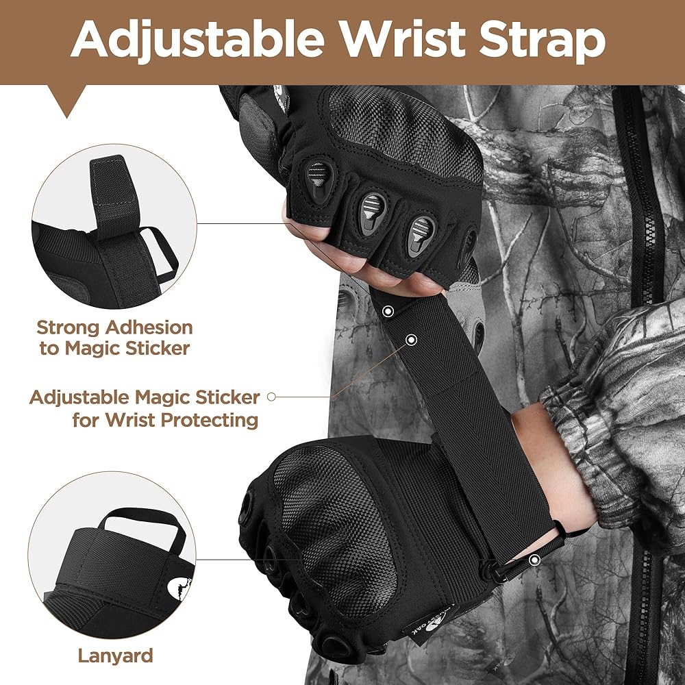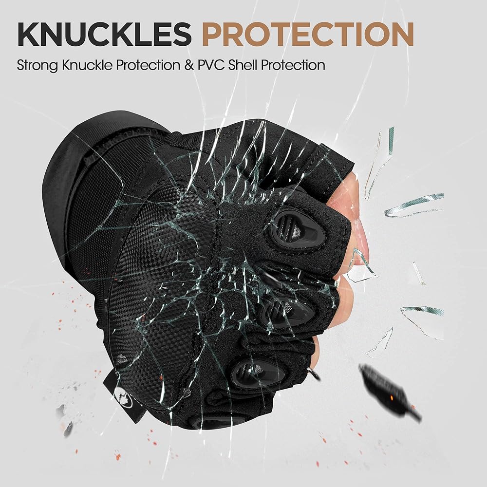 Strong Knuckle Protection: These fingerless tactical gloves provide the right balance of flexibility and protection. The PVC shell at the knuckles of full-finger tactical gloves can increase the cushioning effect and resist the impact of sharp objects. The palm panel of climbing gloves is reinforced to withstand extra wear & tear with PU Leather