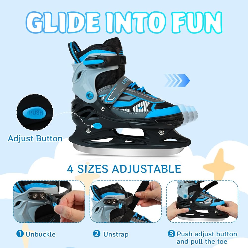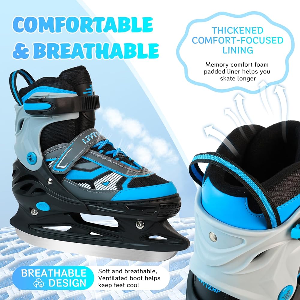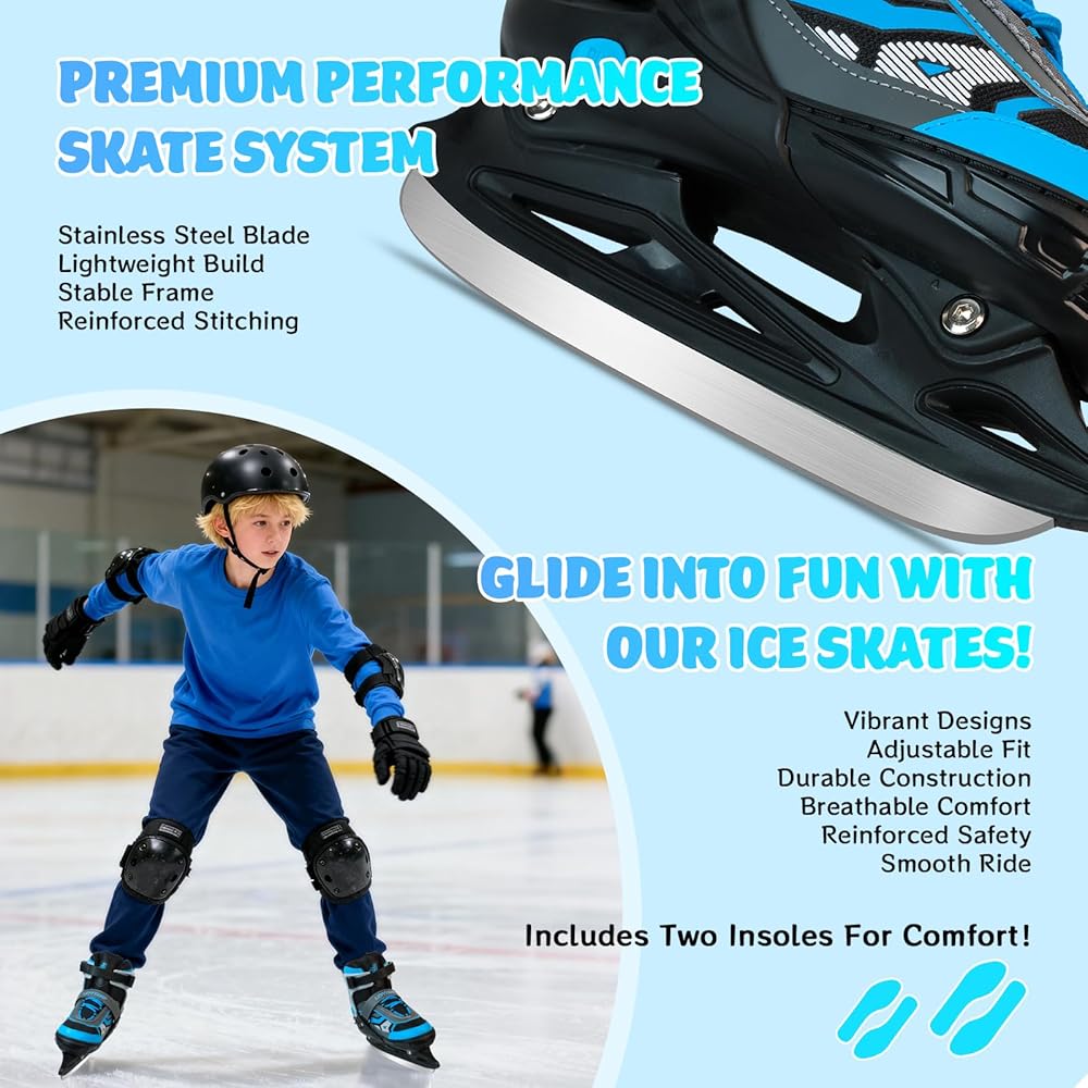 • 4 مقاسات قابلة للتعديل لجميع الأعمار - شاهد طفلك ينمو مع زلاجات الجليد هذه! التصميم المبتكر القابل للتعديل بأربعة مقاسات يناسب الأطفال الصغار (S)، والأطفال في مرحلة النمو أو المراهقين (M)، وحتى البالغين (L) - ما عليك سوى التحقق من جدول مقاسات التزلج على الجليد للحصول على المقاس المثالي. مثالية للتزلج الترفيهي أو التدريب الحر!
