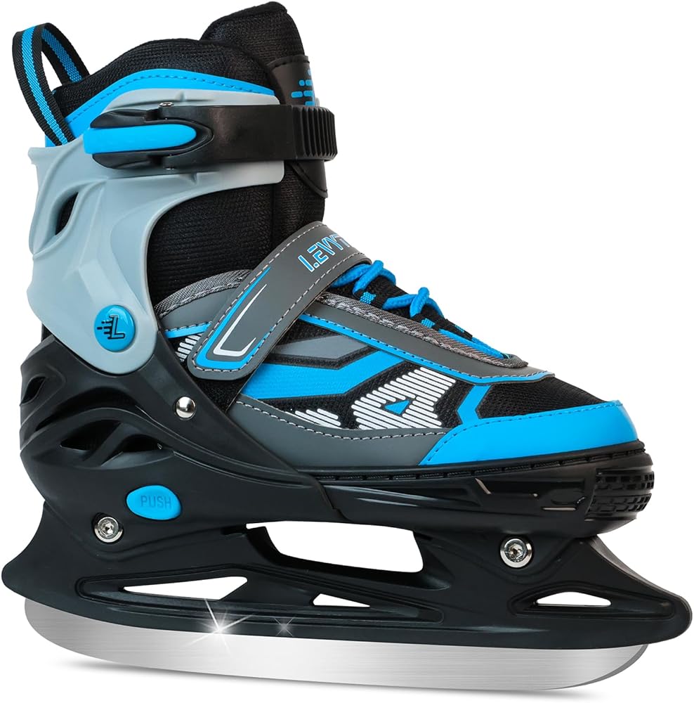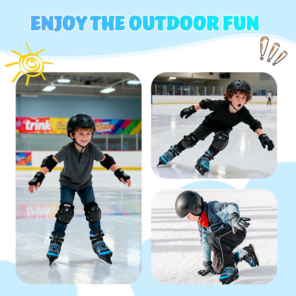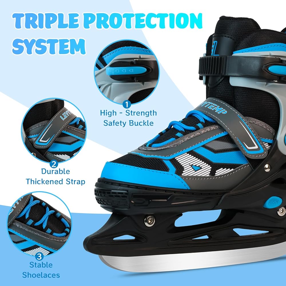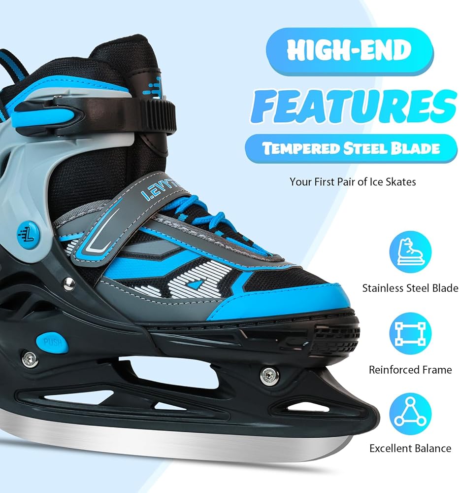 • 4 مقاسات قابلة للتعديل لجميع الأعمار - شاهد طفلك ينمو مع زلاجات الجليد هذه! التصميم المبتكر القابل للتعديل بأربعة مقاسات يناسب الأطفال الصغار (S)، والأطفال في مرحلة النمو أو المراهقين (M)، وحتى البالغين (L) - ما عليك سوى التحقق من جدول مقاسات التزلج على الجليد للحصول على المقاس المثالي. مثالية للتزلج الترفيهي أو التدريب الحر!