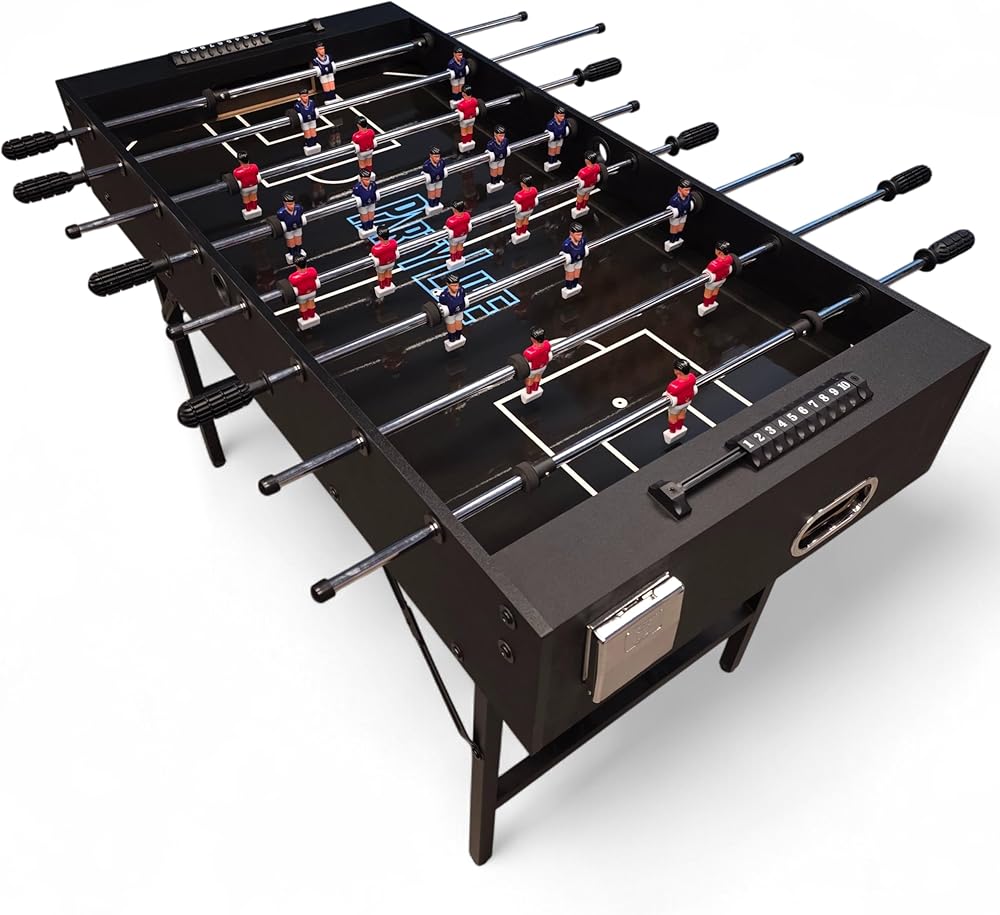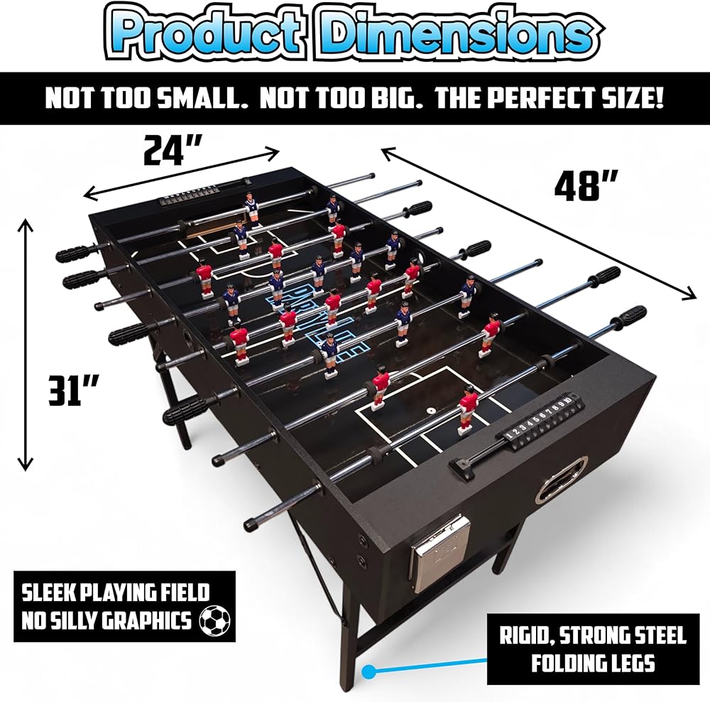 • 48" FOOSBALL SOCCER TABLE w/ LED LIGHTS – Perfect for Home, Game Room & Office Fun: This full-size 48-inch PartyLife foosball table features stunning LED lights, attached folding steel legs w/ adjustable leveling feet, smooth & responsive rods, durable players, rigid frame, and laminated surface. INCLUDES: 4 soccer balls, 2 Cup Holders, a manual sliding scoring system (always accurate), and endless fun. Perfect for kids and adults!