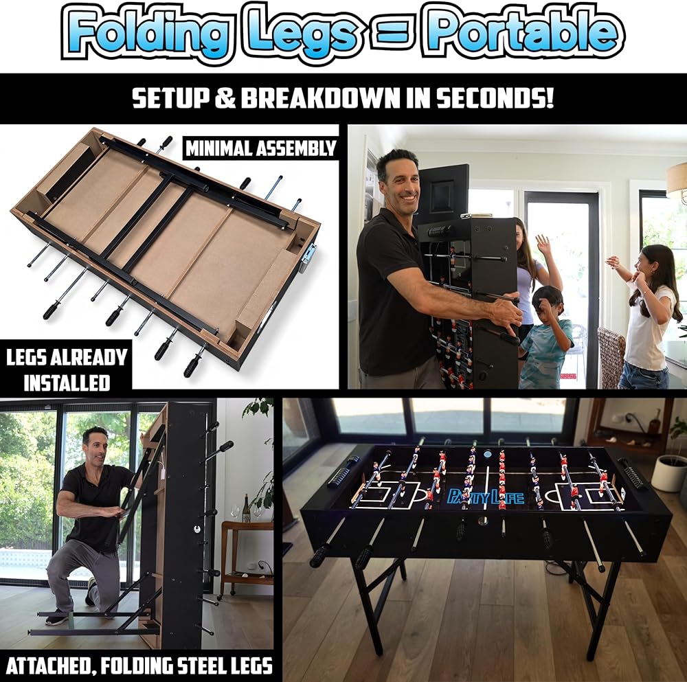 • ATTACHED FOLDING LEGS: From Box to Gameplay in Minutes. Heavy-duty steel legs are already installed - just fold them out, attach scoring system, install rods/players, and start playing! Rock-Solid, heavy-duty folding steel legs with cross-brace supports and leveling feet ensure a rigid and sturdy table and ultimate playing experience.