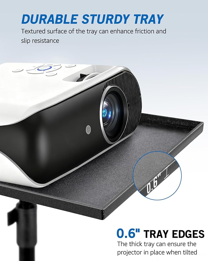 【دعم قوي ومستقر】مصنوع من الألومنيوم السميك لتحقيق الثبات العام، ويتميز حامل ثلاثي القوائم القوي لجهاز العرض بصينية علوية بسمك 0.6 بوصة وحزامين مطاطيين. تدعم سعة تحميل تصل إلى 22 رطلًا، صينية مقاس 16 × 11 بوصة مصنوعة من مادة بوليمر فائقة المتانة وصديقة للبيئة. تتميز بتصميم حواف من أربعة جوانب وسطحها ذو ملمس بلوري، مما يمنع أجهزة العرض أو أجهزة الكمبيوتر المحمولة أو الأجهزة الأخرى من الانزلاق أو الخدش أو السقوط.