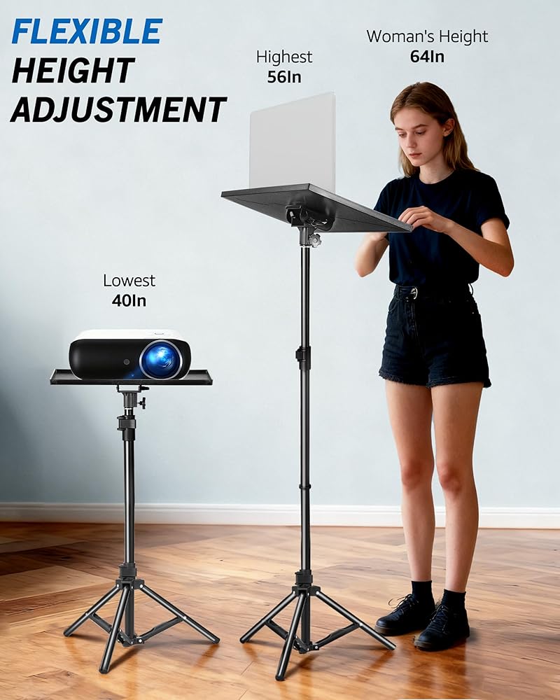 حامل ثلاثي القوائم لجهاز العرض Lusweimi، حامل كمبيوتر محمول قابل للتعديل بارتفاع 56 بوصة مع صينية مقاس 16 × 11 بوصة، حامل جهاز عرض محمول، حامل أرضي ثابت طويل القامة للمكتب والمنزل والخارج والاستوديو ورفوف DJ
