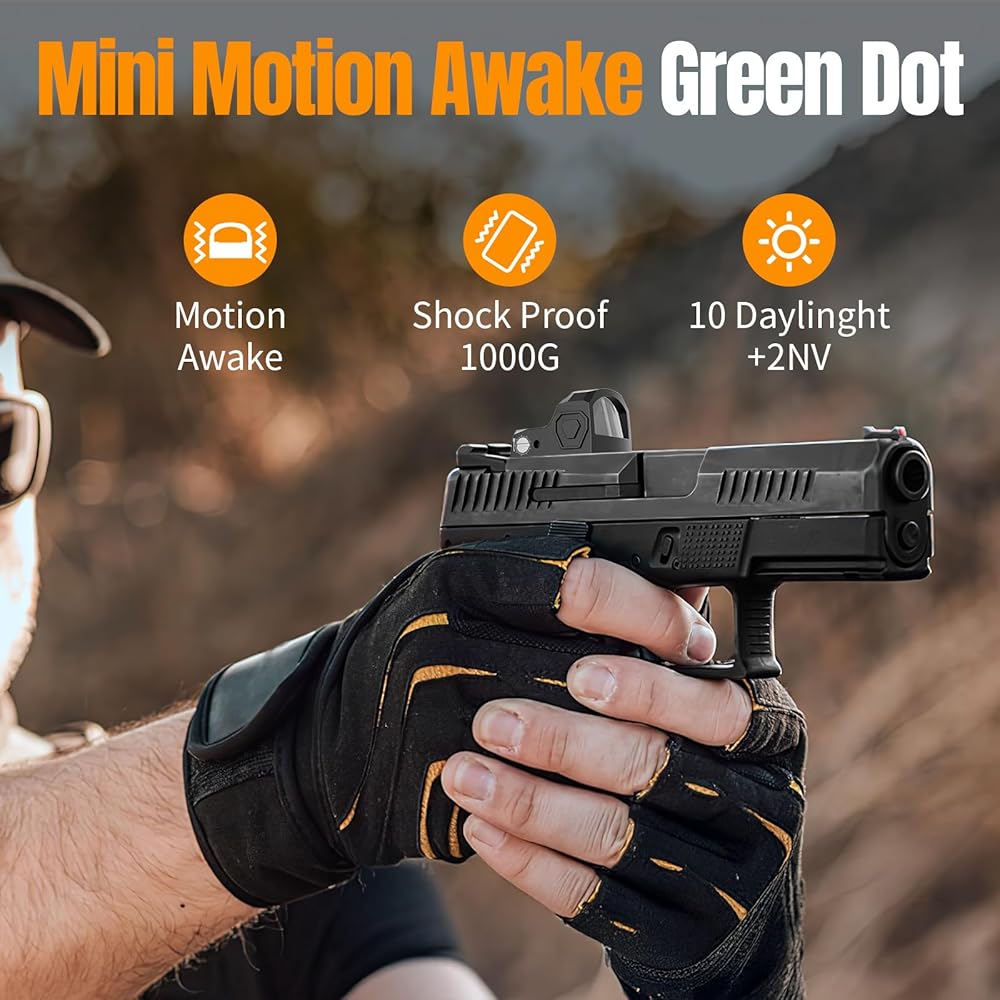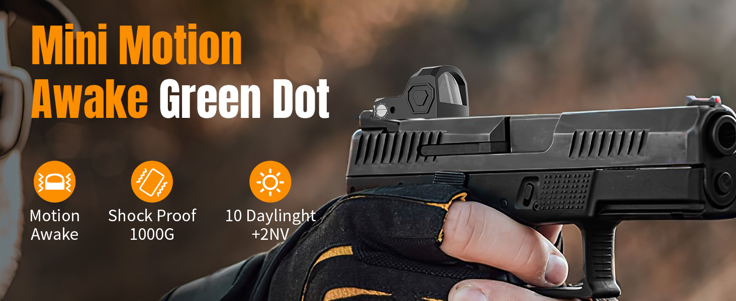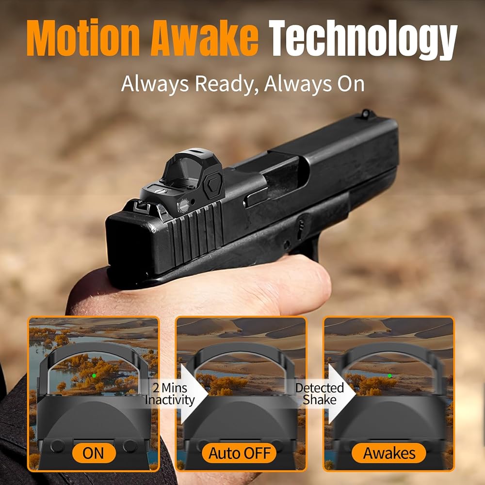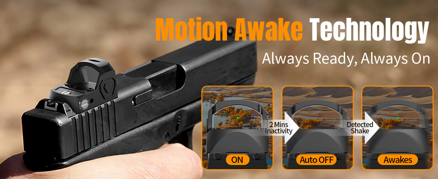 [ Shake Awake Red Dot ] This green dot sight is equipped with motion Awake sensing technology to help conserve battery life.The green dot automatically turns off after 2 minutes of inactivity.Any slight shake or touch will automatically turn the green dot back on and restore it to its previous brightness level.