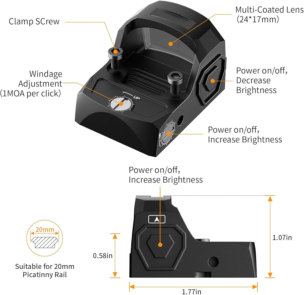 【Low Power Consumption Technology and 12-Level Brightness Adjustment】This green dot sight no't only offers 2MOA reticle and 12 levels of brightness adjustment, combined with the shake wake-up function,it can operate continuously for more than 20,000 hours at the lowest brightness setting.