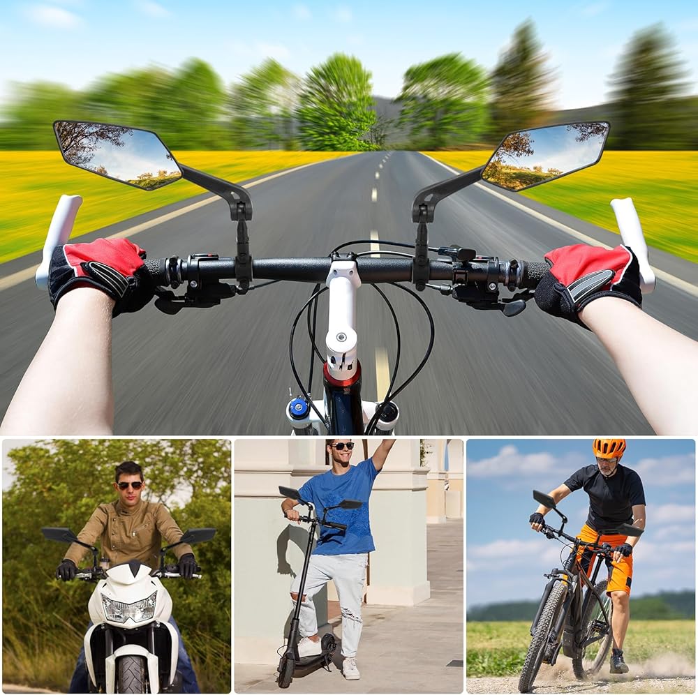 قابلة للدوران وقابلة للتعديل: تم تصميم مرآة الرؤية الخلفية للدراجة بوظيفة تعديل الدوران 360 درجة، والتي يمكن تعديلها على أي زاوية للحصول على أفضل زاوية رؤية، مما يجعل قيادتك أكثر أمانًا.
