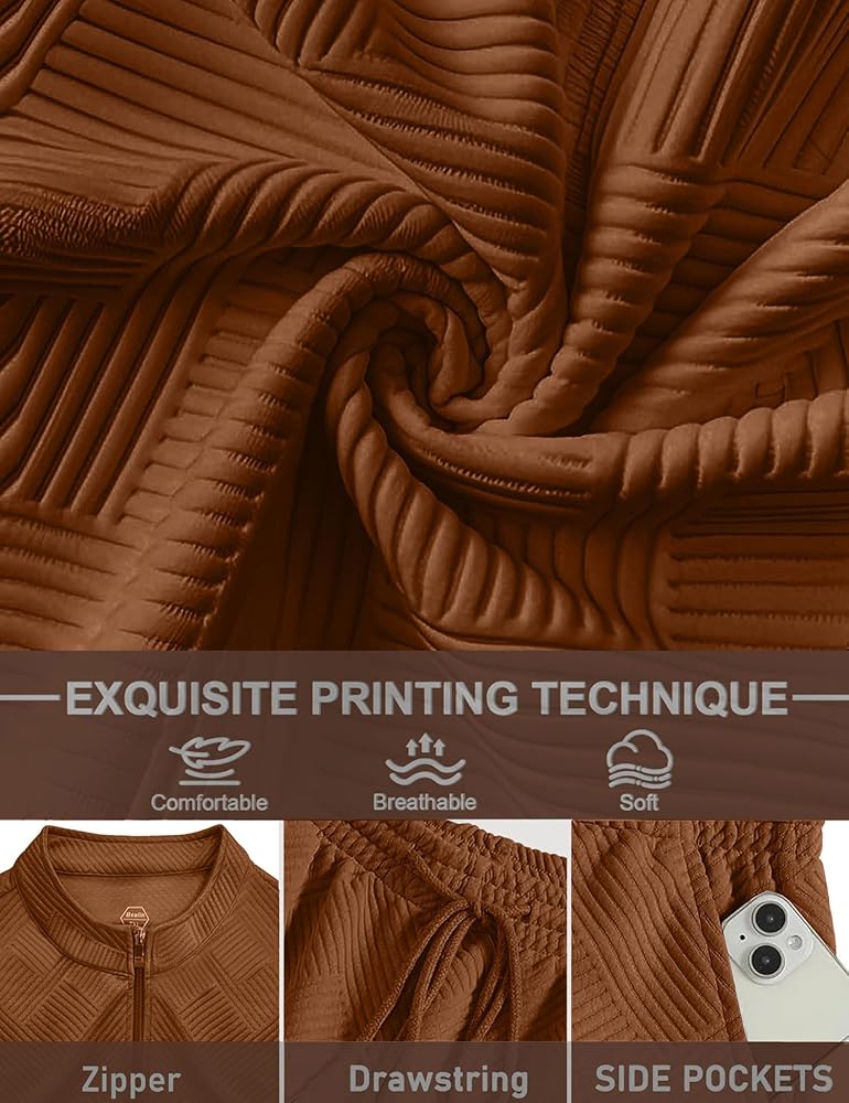• التصميم - يتميز بتي شيرت برقبة دائرية ملائم للعضلات يبرز جسدك، مع شورت مرن برباط مع جيوب عملية. الألوان الصلبة الكلاسيكية والملمس الهندسي تخلق مظهرًا رياضيًا خالداً.