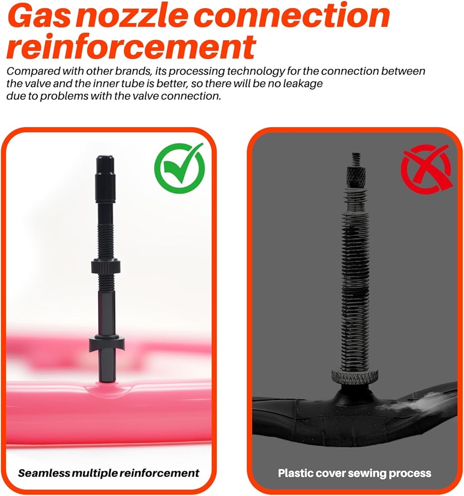Major Upgrade①: Metal Presta Valve: Unlike most TPU tubes that use plastic valve stems, ours feature a precision-machined metal Presta valve for superior airtightness and long-term reliability. The corrosion-resistant metal design enhances durability and maintains stable air pressure during every ride.