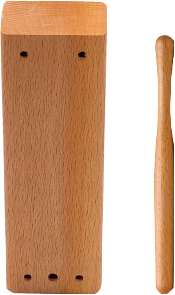 When playing, hold a rectangular stick in your left hand and a cylindrical wooden stick in your right. Strike the rectangular wooden stick with the cylindrical wooden stick to produce a clear and solid sound without a fixed pitch.