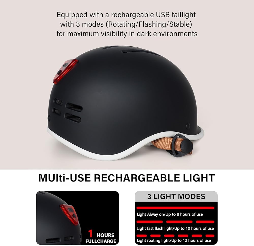 【USB Rechargeable Light】: Our Bicycle helmets included LED light provide the better possible protection and visibility for night riding.The rear lights have 3 modes: constant, flash, slow flash.You don't need to remove the helmet to change the light.