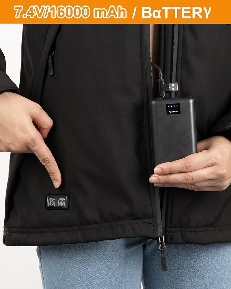 [عبوة Bαtterγ عالية السعة]-- تأتي مجموعة سترة السخان مع حزمة Bαtterγ عالية السعة 16000 مللي أمبير في الساعة، والتي تسمح بما يصل إلى 16 ساعة من التسخين المستمر. يمكن أن تعمل السترة النسائية المُدفأة مع حزمة Bαtterγ المضمنة لمدة 12-16 ساعة (منخفضة)، و8-12 ساعة (متوسطة)، و5-8 ساعات (عالية) بشحنة واحدة.