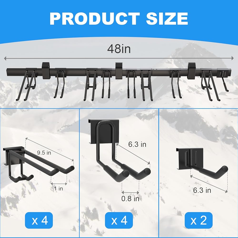 تصميم مسافة قابلة للتعديل: رف التزلج للجراج مناسب لأي مسافة بعد، بما في ذلك المسافة القياسية 16 بوصة/18 بوصة/24 بوصة/32 بوصة/36 بوصة من مسامير الحائط. جميع الخطافات والرف غير مدمجة ويمكن تعديل مساحة التخزين بمرونة قبل التثبيت.