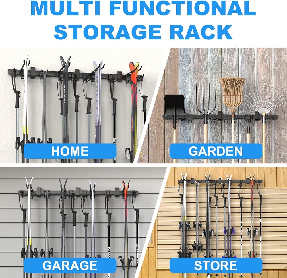 تخزين متعدد الأغراض: يعمل رف الحائط للتزلج بشكل جيد كنظام منظم للتخزين، بغض النظر عن المنزل أو المرآب أو الحديقة أو عرض المتجر. الرف ليس أكثر من مجرد حامل تزلج، فهو مناسب أيضًا لتنظيم الأشياء الأخرى، مثل قضبان الصيد والمجارف والمكانس والكراسي القابلة للطي والمظلات والحقائب وما إلى ذلك.