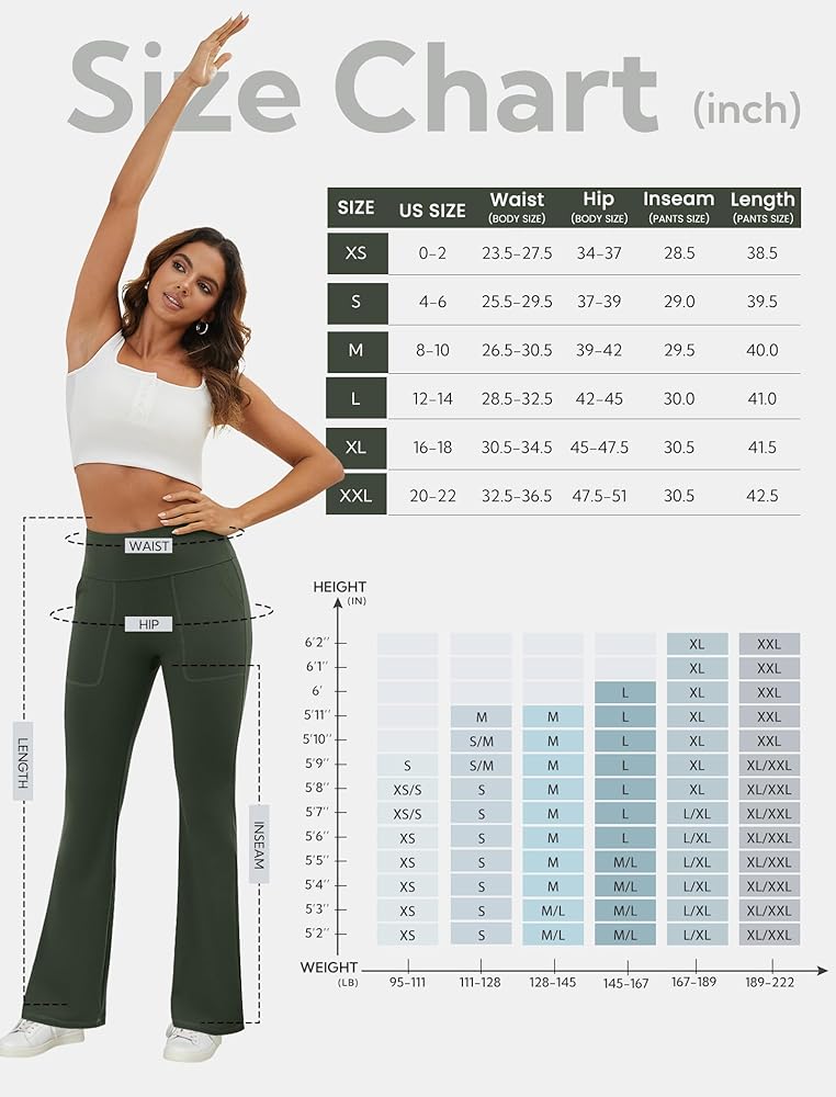 • طماق Bootcut للنساء: استمتع بأجواء كلاسيكية مع تصميم عصري. يبدأ تصميم الساق الواسعة الأنيق للسيدات من الركبة، مما يخلق خطًا طويلًا نحيفًا يكمل أي شكل جسم. تجعلك السراويل الضيقة ذات الجرس تبدو وتشعر بالروعة من صالة الألعاب الرياضية إلى الغداء