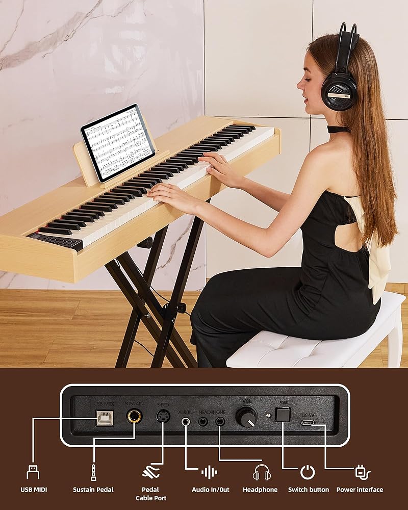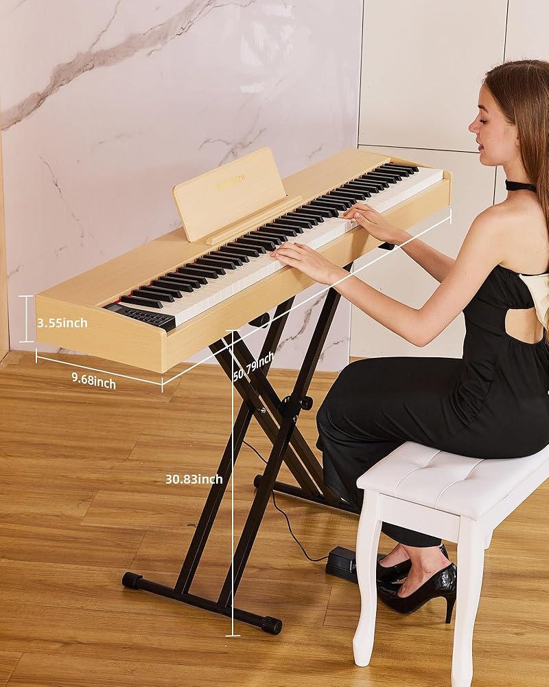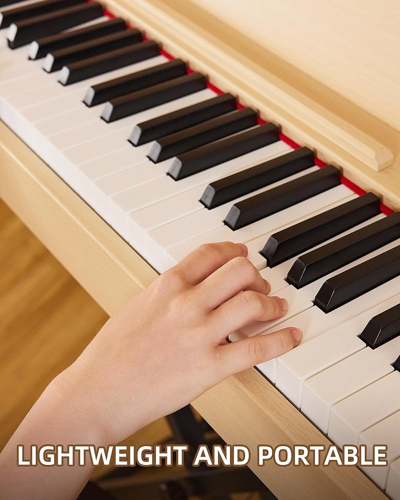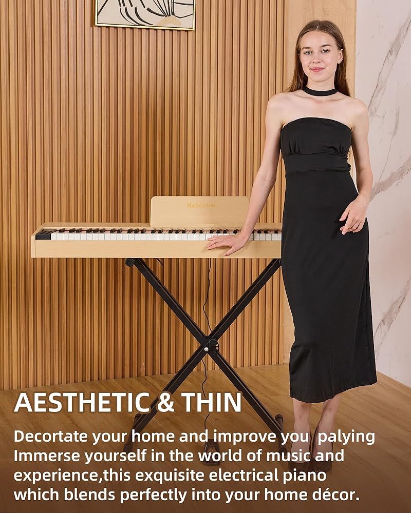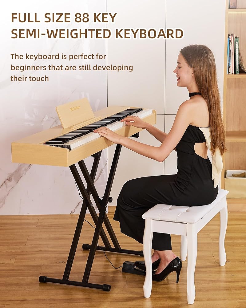 لوحة مفاتيح مرجحة بـ 88 مفتاحًا - استمتع بلمسة البيانو الصوتية الأصلية مع تقنية لوحة المفاتيح الموزونة Melenrto 88 مفتاحًا. المفاتيح شبه الموزونة حساسة للمس، ومثالية لبناء قوة الأصابع للمبتدئين وتحسين التقنية للاعبين المتقدمين. مثالية لإتقان ديناميكيات لوحة مفاتيح البيانو المكونة من 88 مفتاحًا.