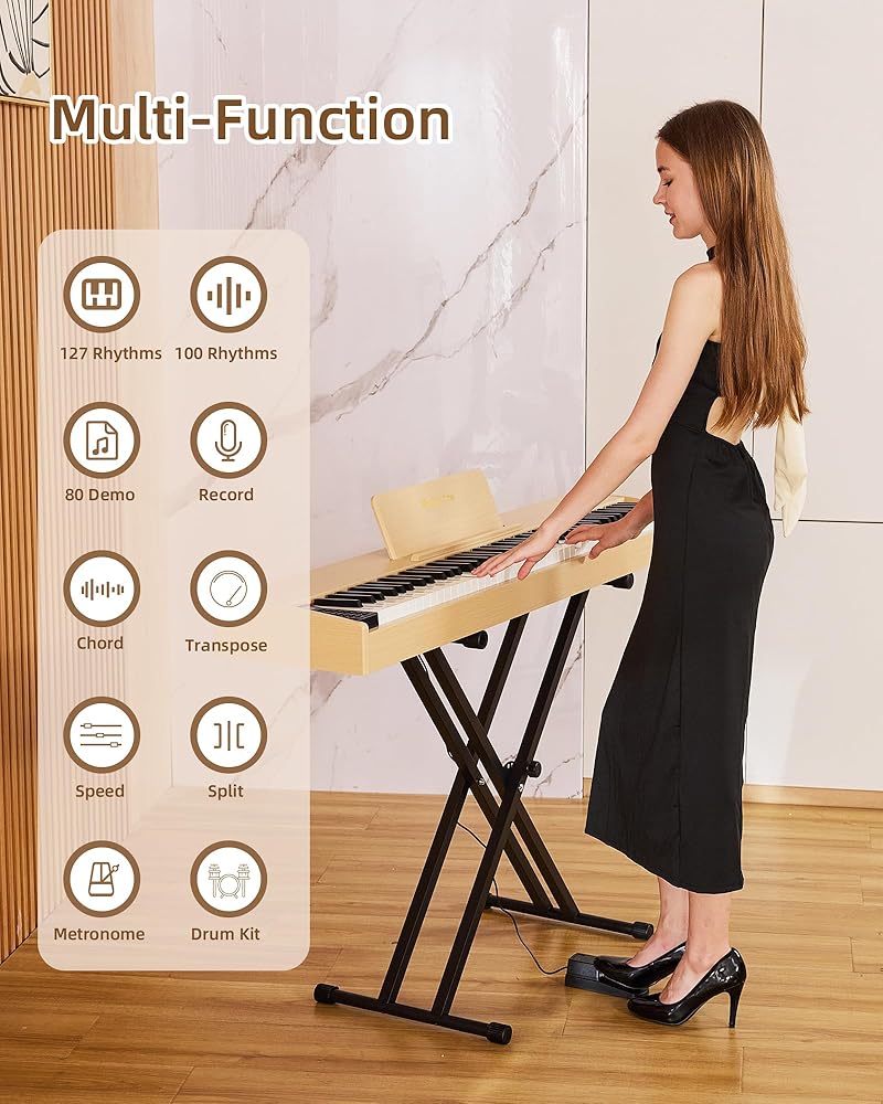 بيانو لوحة مفاتيح كهربائية محمولة مع حامل X - أزواج لوحة المفاتيح Melenrto 88 مع حامل X قابل للفصل (مضمن) لتحقيق الاستقرار الاحترافي في أي مكان. مثالي للموسيقيين والاستديوهات المنزلية على حد سواء، حيث يعيد بيانو لوحة المفاتيح الكهربائية هذا تعريف التنقل دون المساس بوظائف الحجم الكامل.