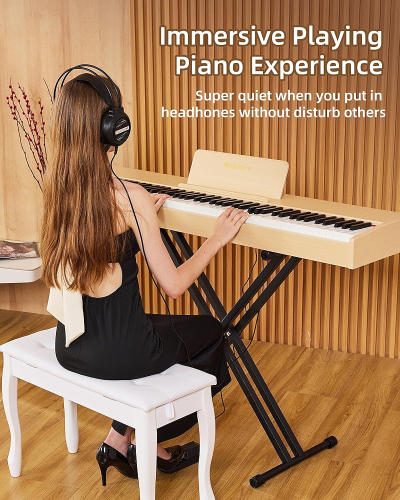 صوت بيانو رقمي عالي الجودة - توفر شريحة الصوت المتقدمة نغمات غنية ذات طبقات. استمتع بصوت بجودة الاستوديو لعروض البيانو الكهربائي Melenrto، سواء كنت تتدرب باستخدام سماعات الرأس أو الاتصال عبر البلوتوث للعب غامر.