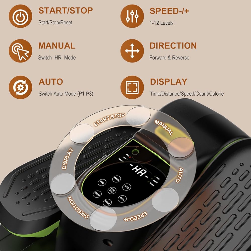 5 Modes & Adjustable Speeds: This seated elliptical offers 5 modes: HR mode with 12 speed levels,3 pre-programmed modes (P1-gentle, P2-Walk and P3-Sport) and no electric mode - pedal by your own. Pedals can move forwards or reverse to engage different muscle groups