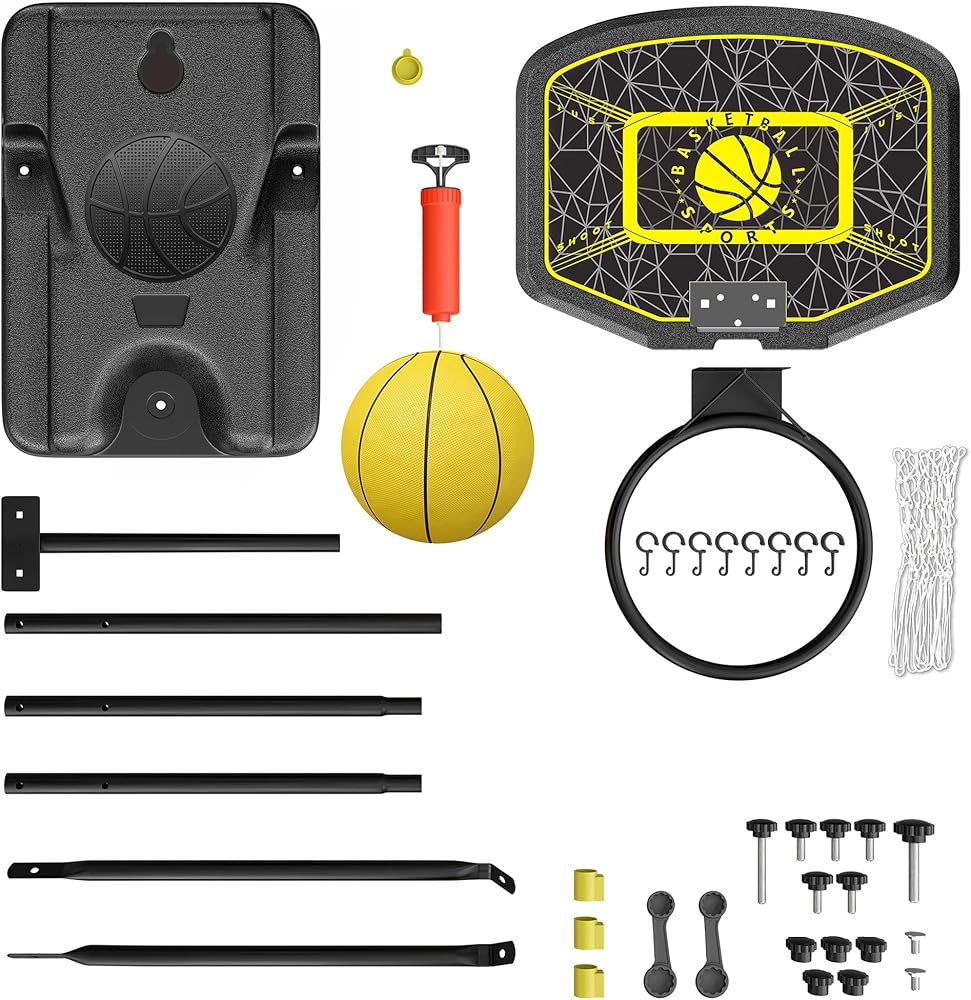 • 【Basketball Hoop for Kid】The kids basketball hoop come with a basketball backboard, 1 basketball, an inflatable pump, a rim, a net, a sturdy base and other accessories. Extremely easy to assemble and take apart referring to the installation instruction. The height of this mini basketball hoop is adjustable, it can be adjusted according to kids' growing height from 3.6ft to 6.2ft, suitable for kids aged 3-8 with different heights.